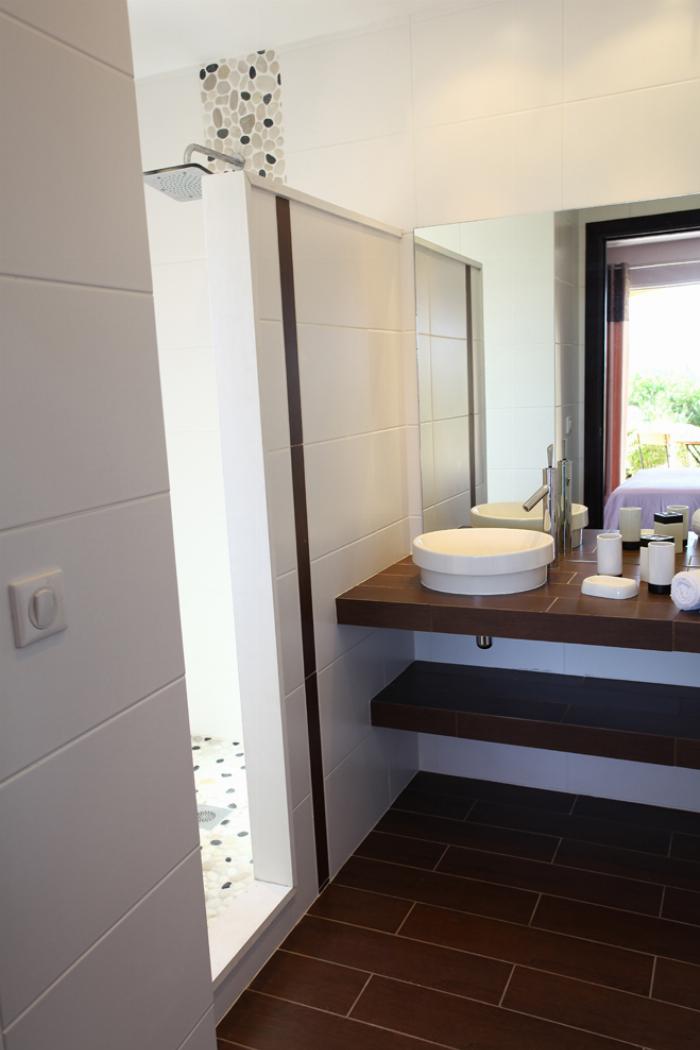Chambre double avec accès terrasse, lit 160 et Salle de bain en suite avec douche, lavabo simple