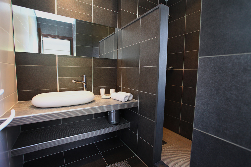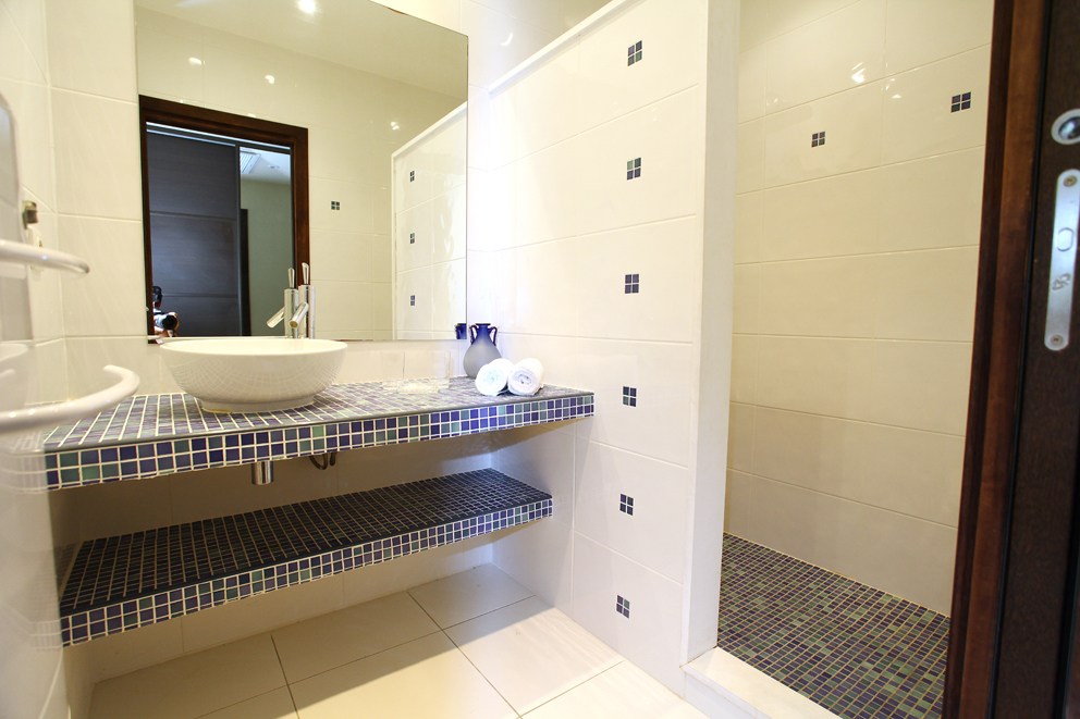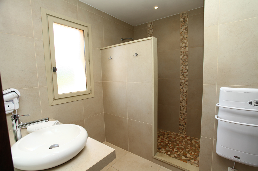 Chambre double avec lit 160, accès terrasse et Salle de bain en suite avec douche, lavabo simple