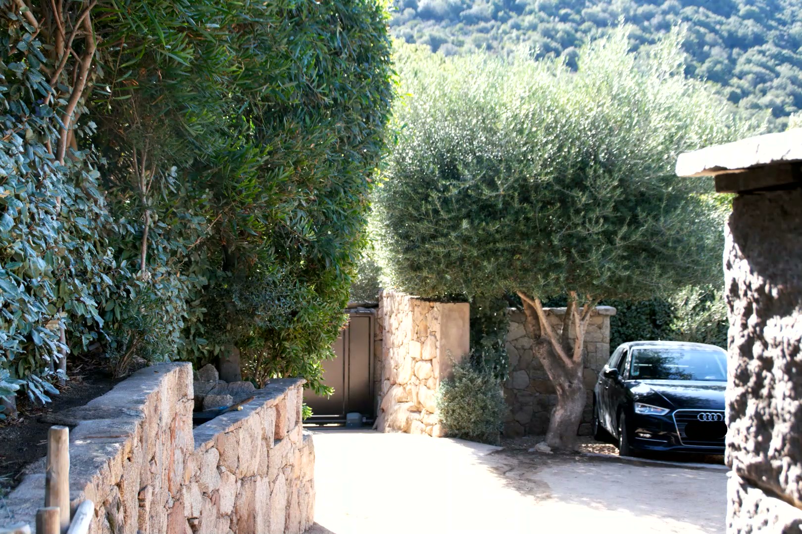 Le jardin est arboré de plantes méditerranéennes, les oliviers se mélangent aux essences du maquis Corse comme le romarin et la lavande.