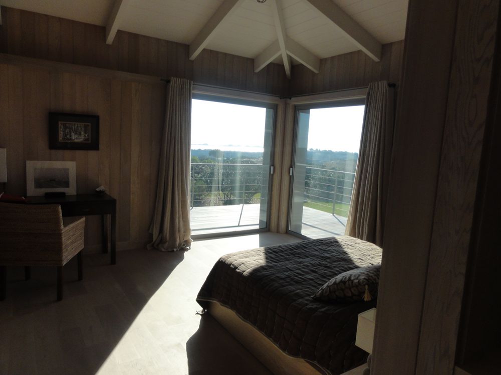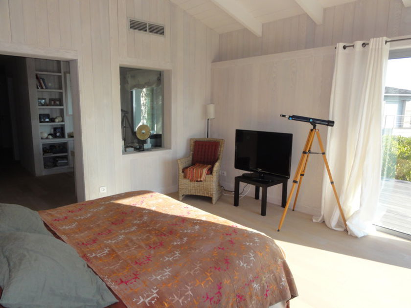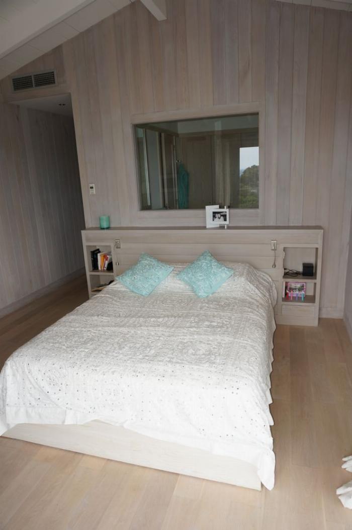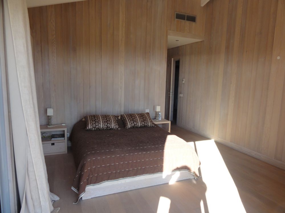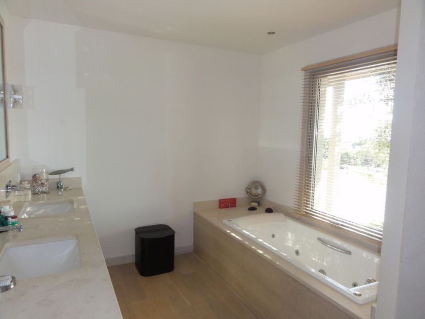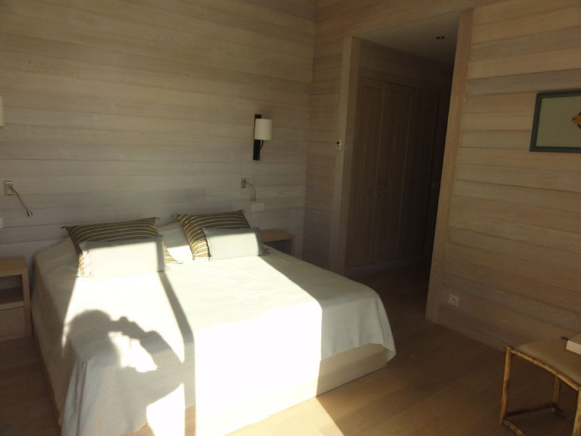 Chambre de Maître N°1 avec vue mer, vue jardin, vue piscine, climatisation, télévision plasma, ordinateur, internet et Salle de bain en suite avec hydro massage, lavabo double, baignoire, douche et WC separé et Terrasse privée