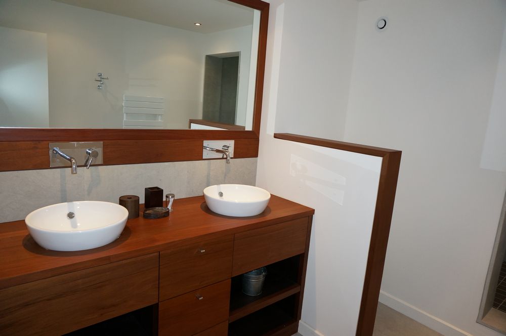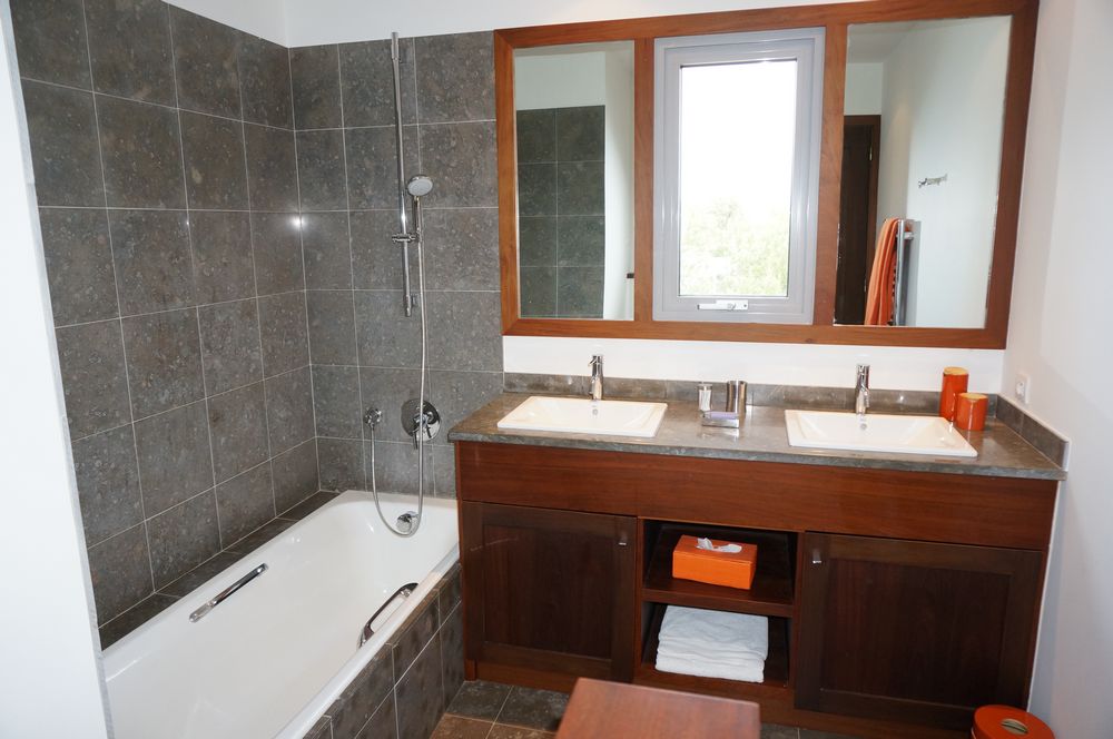 Chambre double N°5 avec vue mer, vue jardin, vue piscine et Salle de bain en suite avec wc, lavabo double, baignoire
