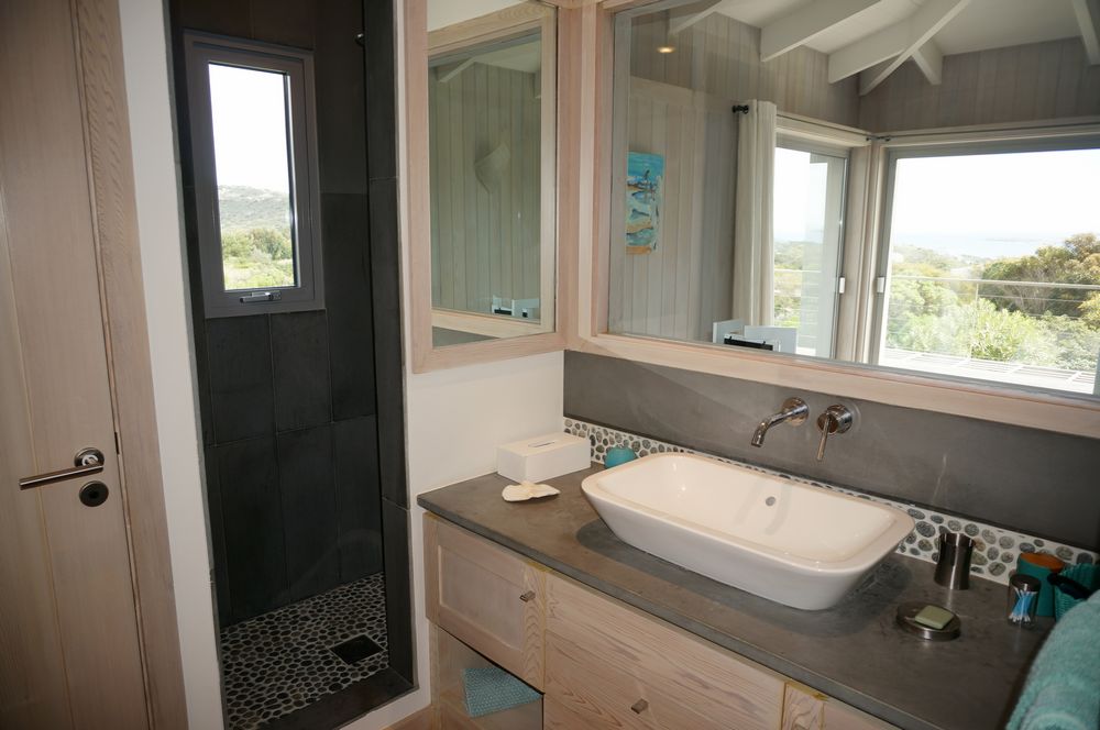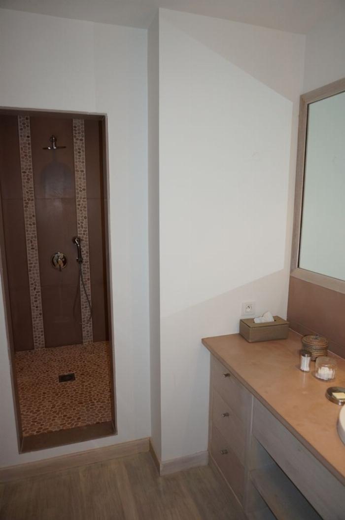 Chambre à lits jumeaux N°3, accès par l’arrière du jardin avec vue mer, vue jardin, vue piscine et Salle de bain en suite avec lavabo double, wc, douche