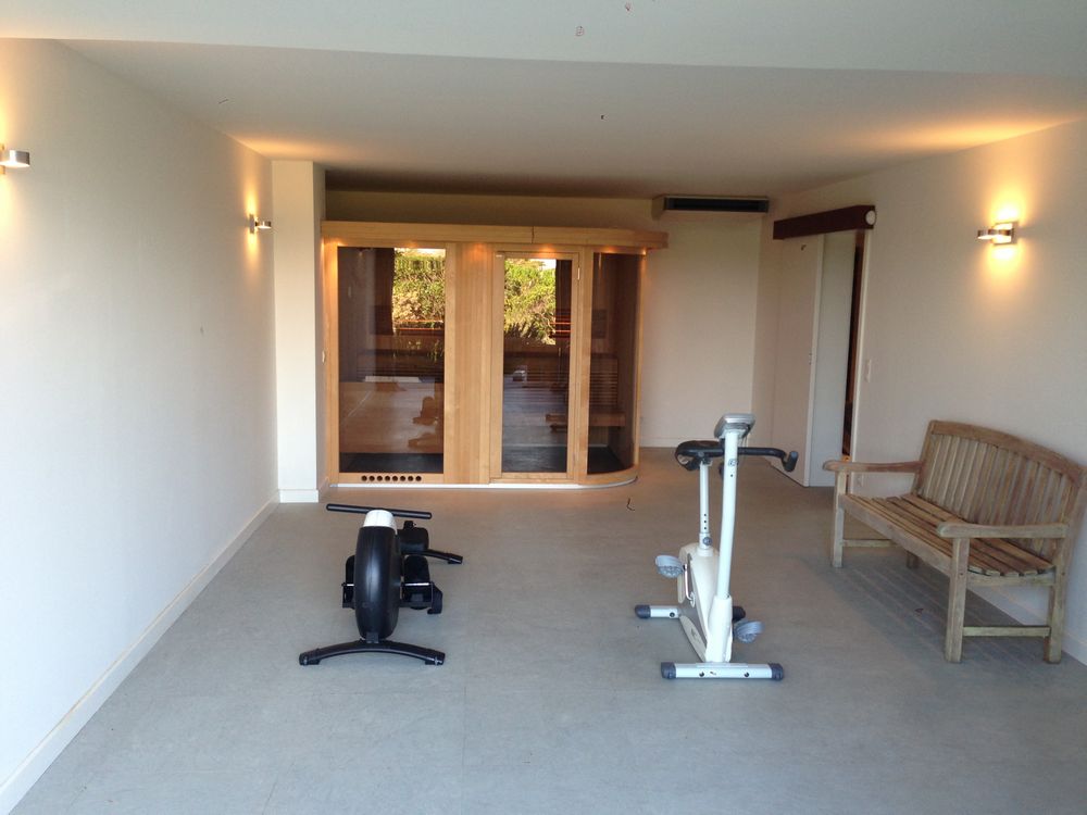 Salle de Gym avec elliptique, banc musculation, vélo, tapis de sol