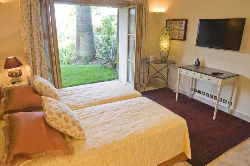 Chambre à lits jumeaux avec lit 90, télévision, accès jardin et Salle de bain en suite avec lavabo double, wc, douche