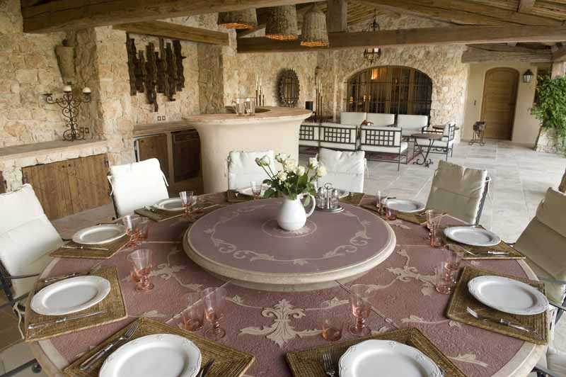 La salle à manger d'été fait le lien entre les deux ailes de la villa. Agrémentée d'un salon de jardin, c'est un espace convivial où l'on aimera se retrouver en famille ou entre amis pour déguster un apéritif, lire, bronzer et profiter de la piscine.