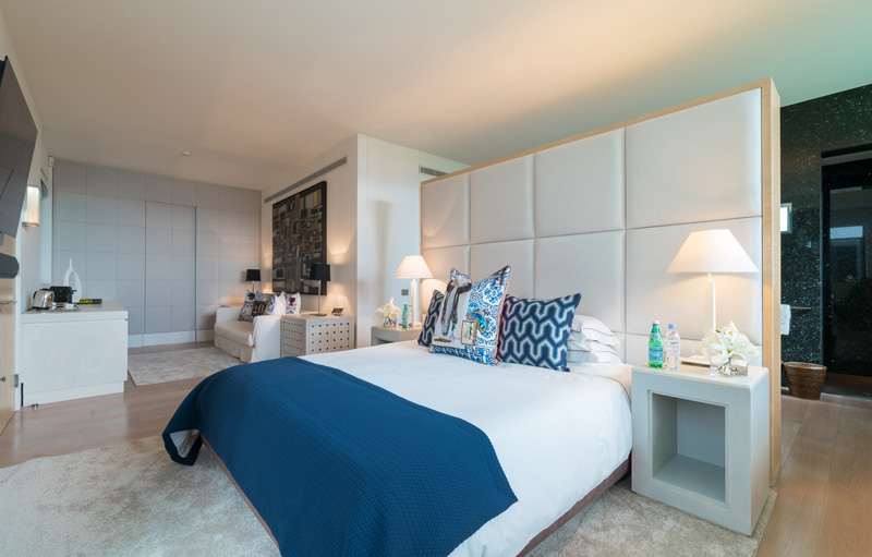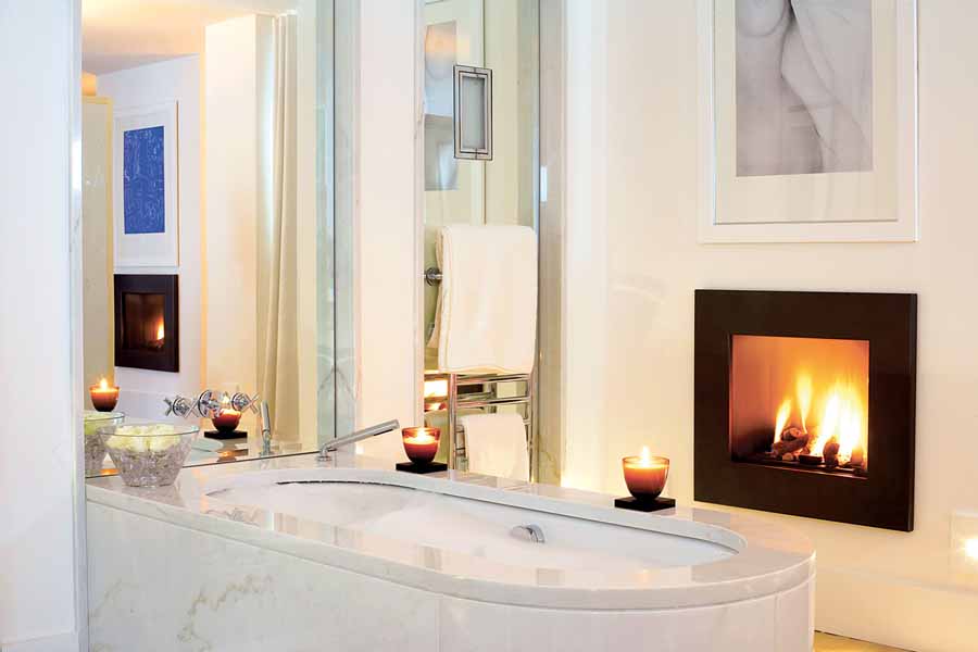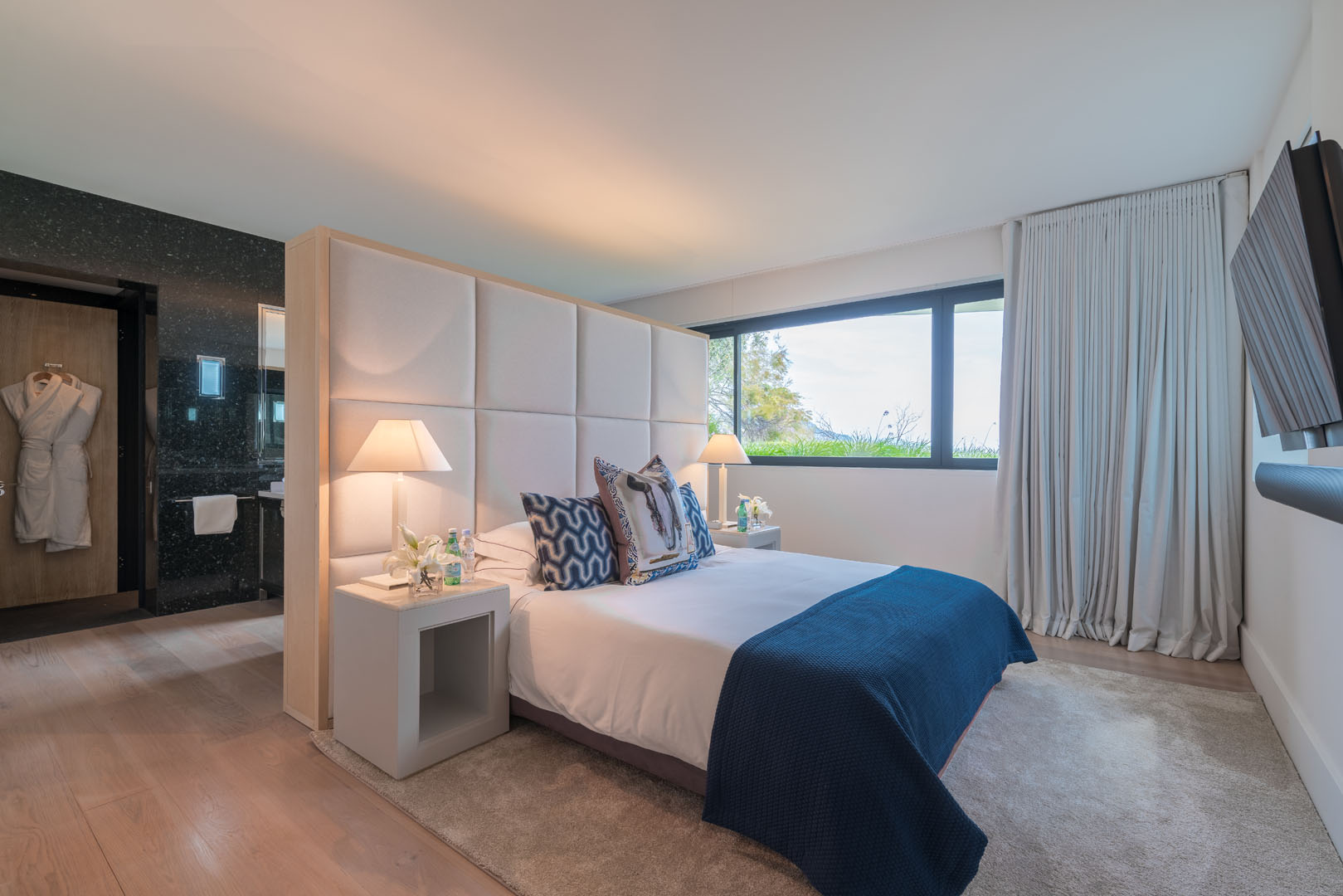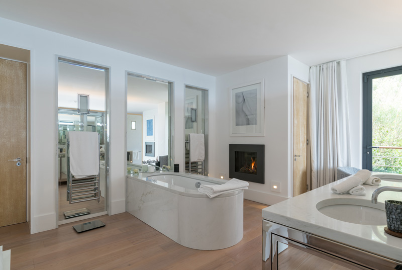 Chambre de Maître 4 : dressing, cheminée, TV, lit double, sale de bain en suite (douche pluie) avec cheminée. Toilettes. Terrasse privée.
