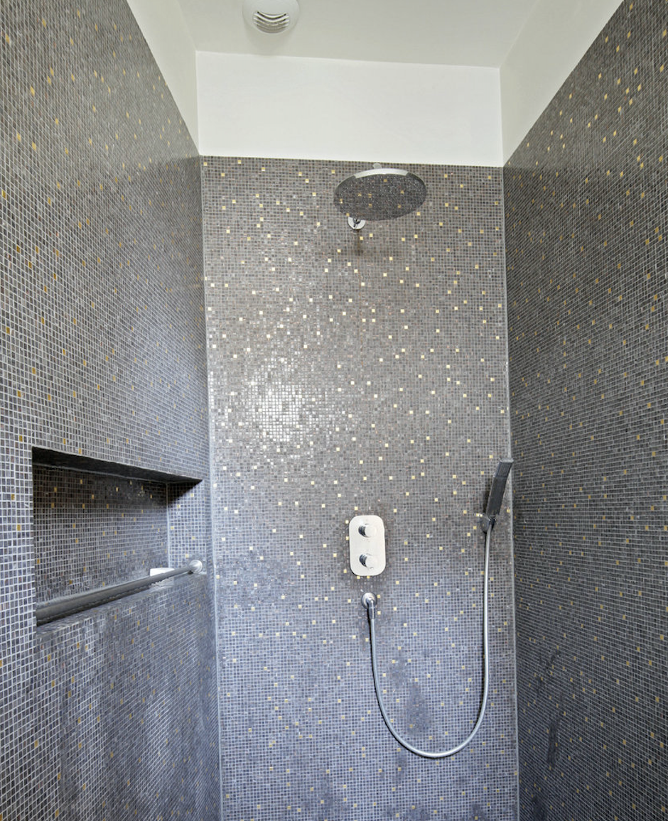 Salle de bain partagée par les chambres 2 et 5 avec douche, chauffe serviettes, lavabo simple