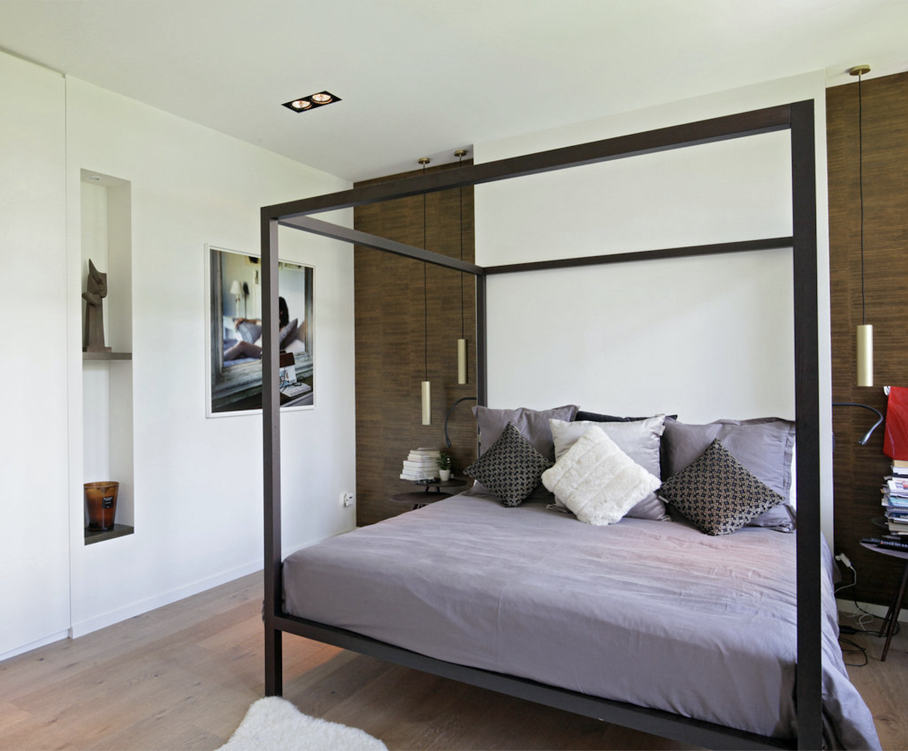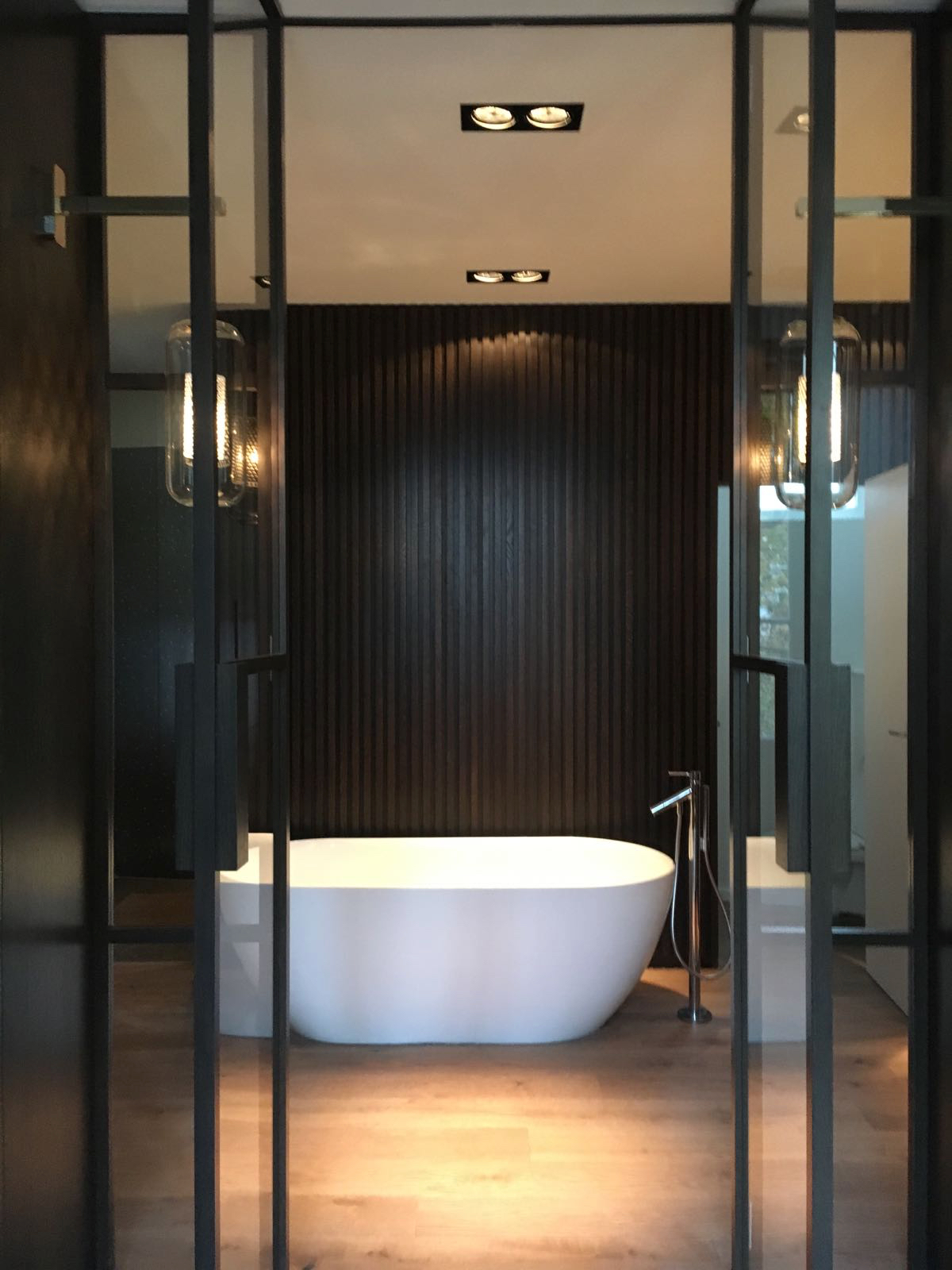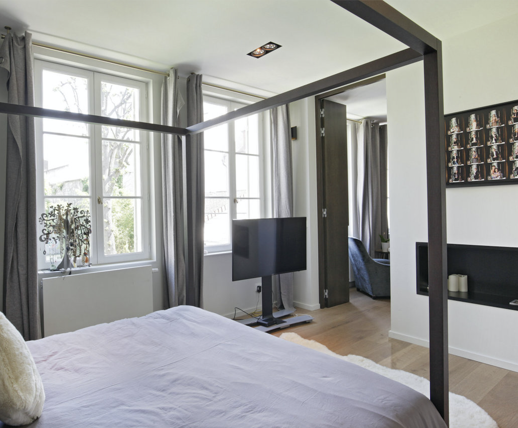 Chambre de Maître avec cheminée à l’éthanol et lit 170 cm avec vue jardin, dressing, télévision et Salle de bain en suite avec baignoire, douche, wc, lavabo double