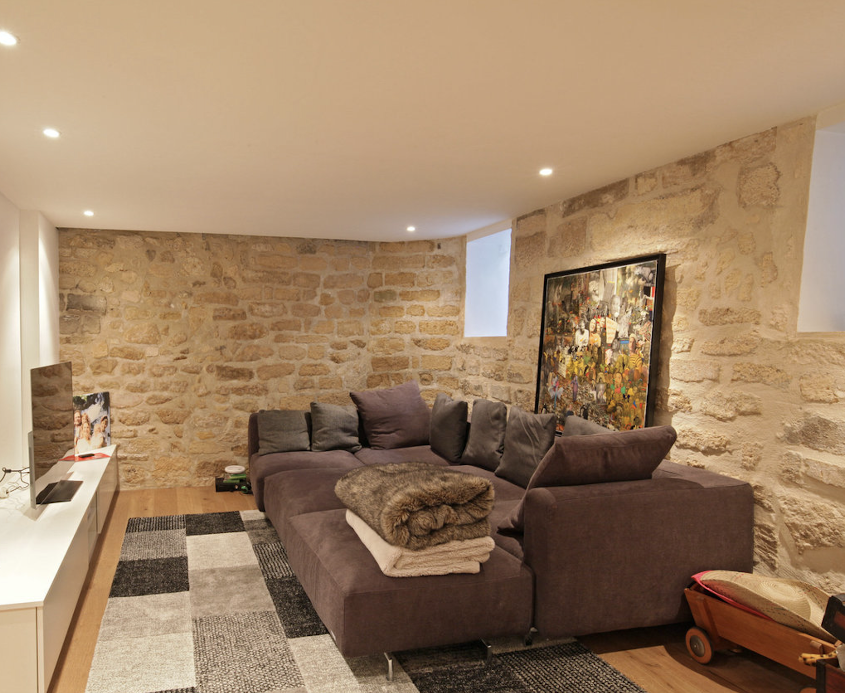Salle TV avec un grand canapé avec télévision