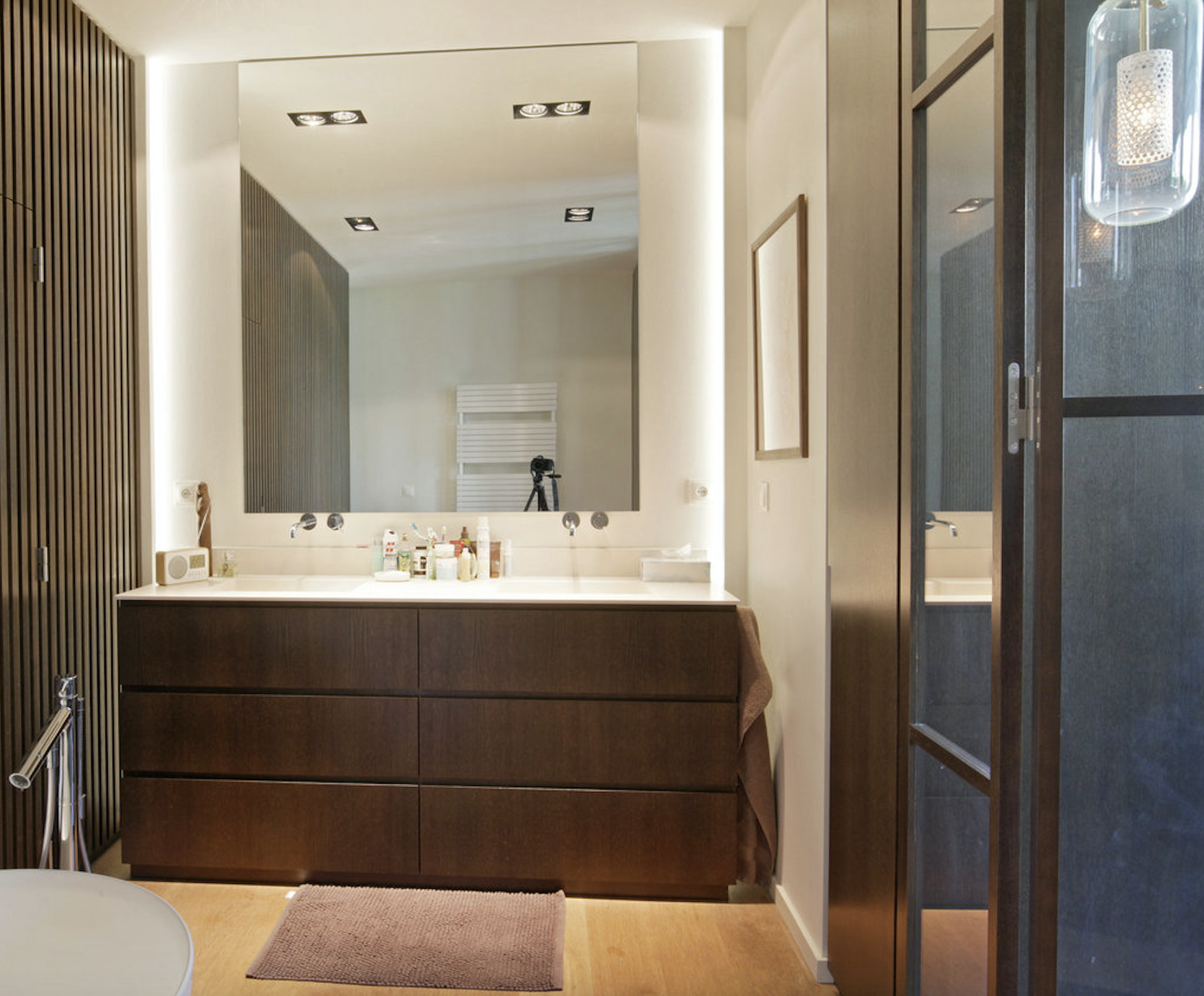 Salle de bain partagée par les chambres 3 et 4 avec douche, baignoire, chauffe serviettes, lavabo double