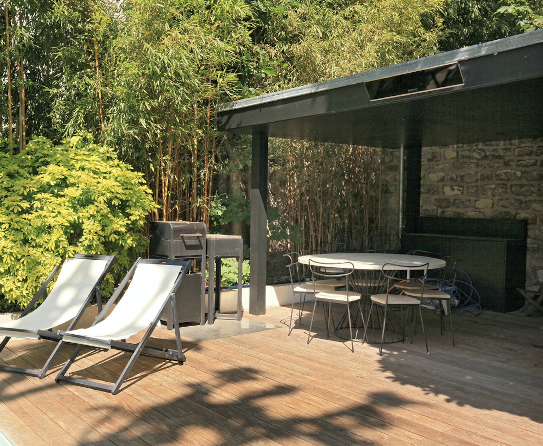 Terrasse aménagée avec coin salon, barbecue