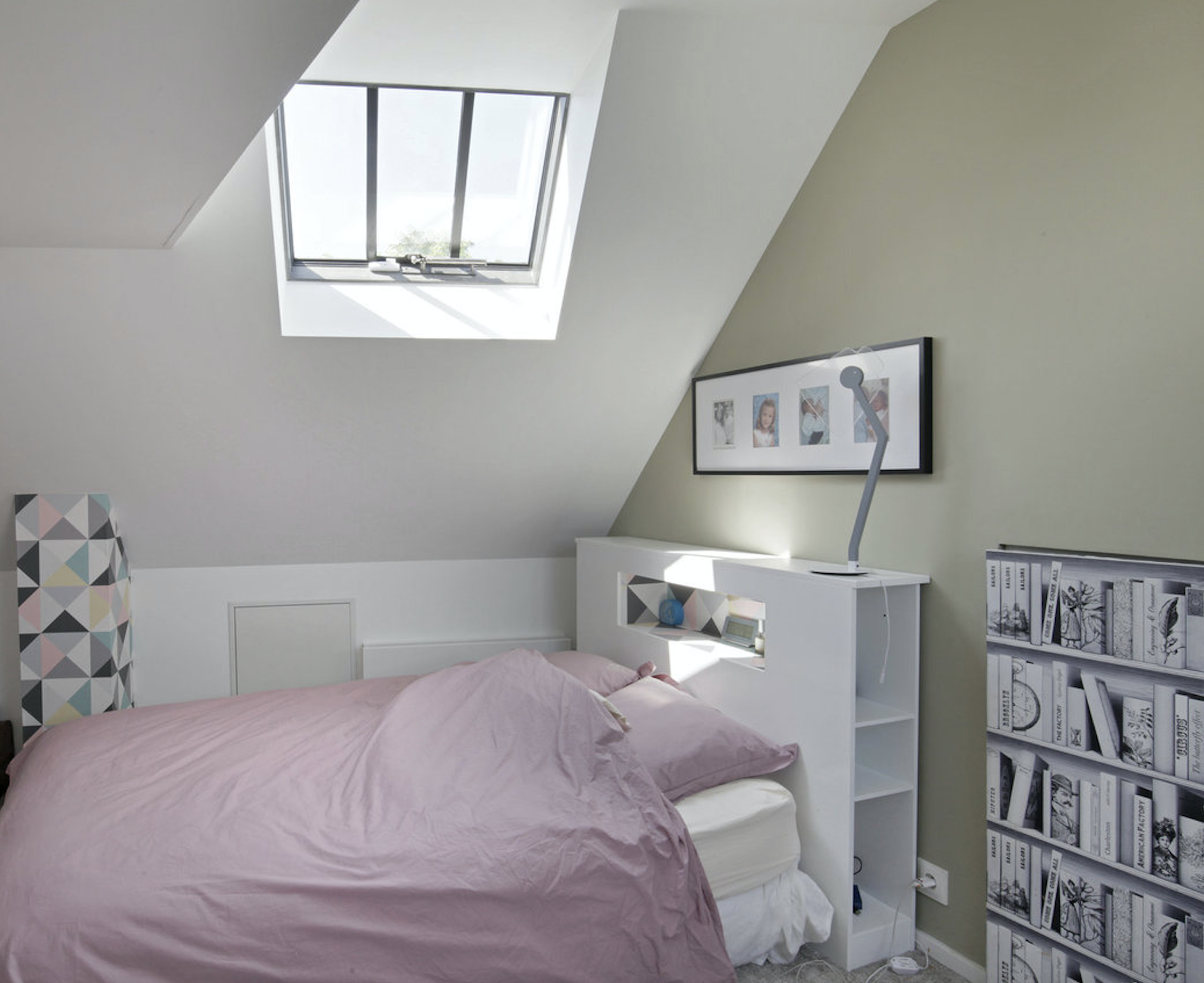 Chambre simple pour enfant avec un matelas supplémentaire disponible pour un deuxième enfant, accès commun à la salle de bain avec la chambre 2. Il y a une barrière de protection pour les escaliers avec vue jardin, lit 80