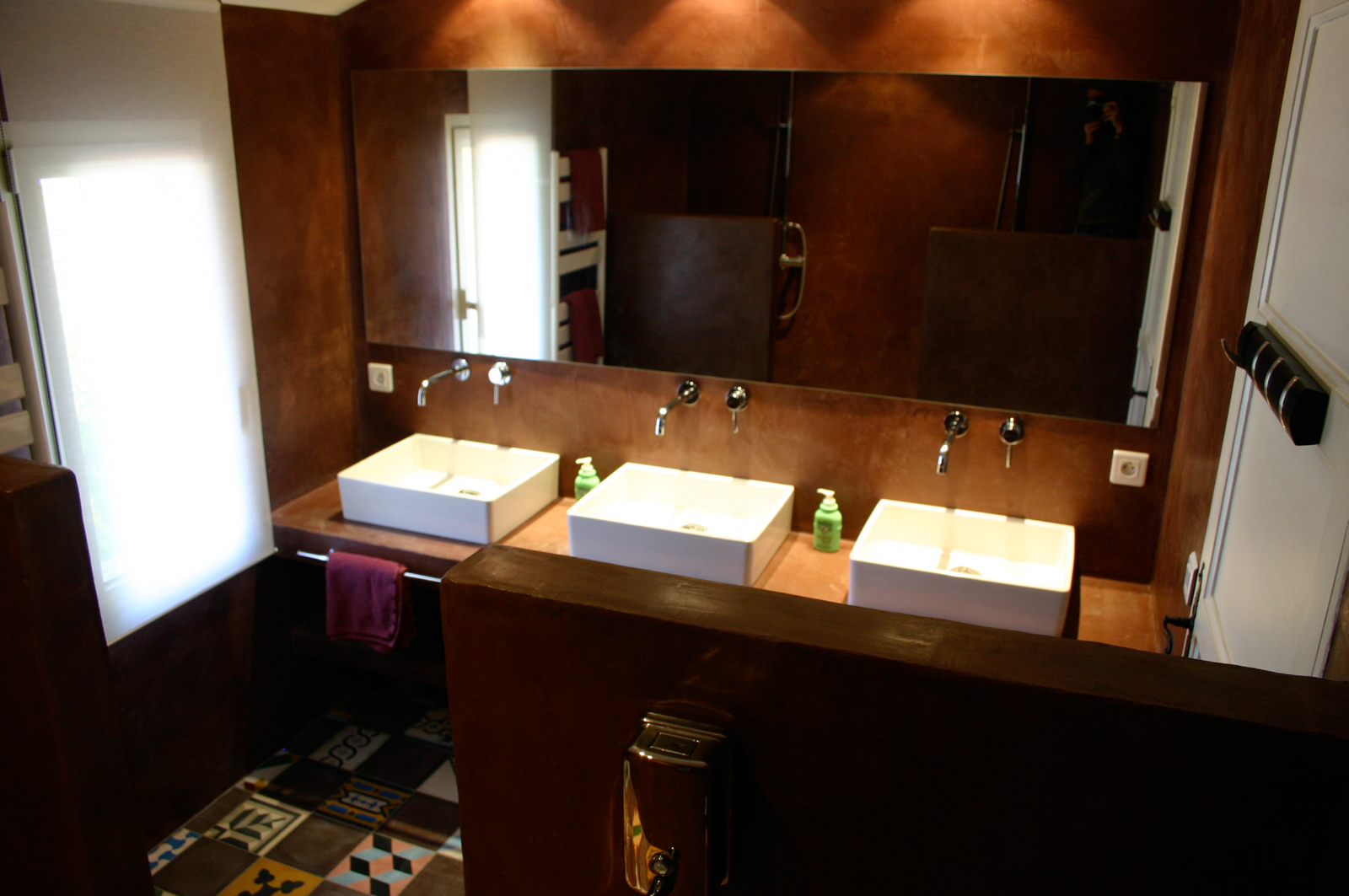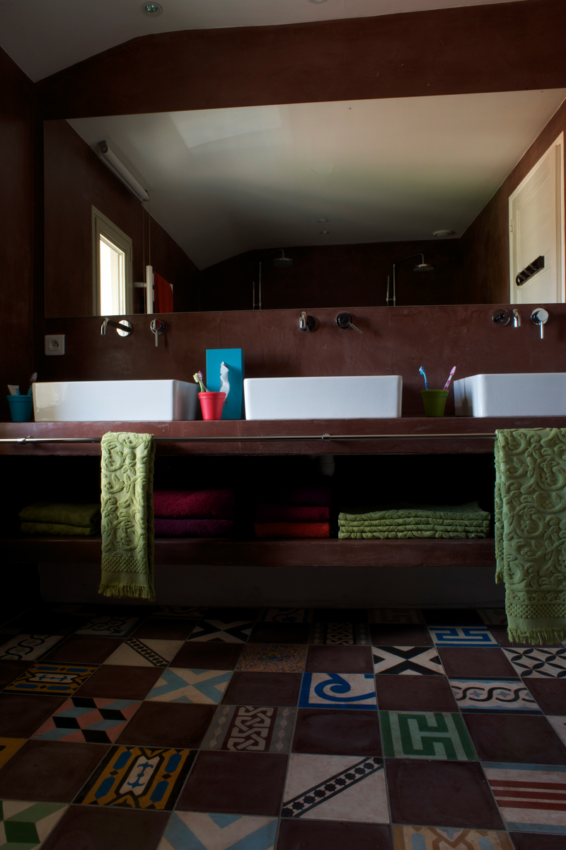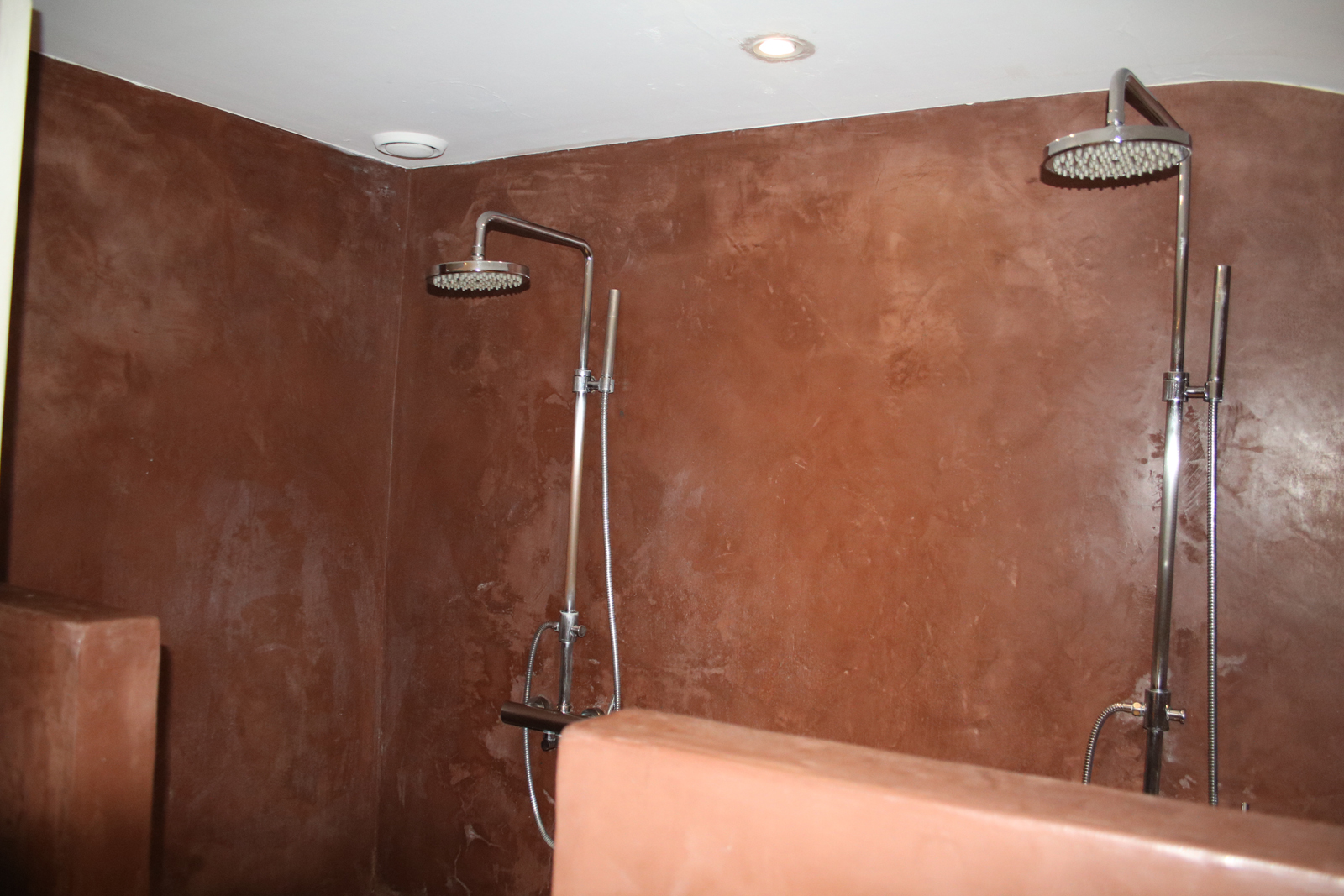 Salle de bain partagée pour les chambres 8 et 9, avec double douche et triple vasque, WC séparé et urinoir, dans l’esprit des vestiaires d’un club de sport