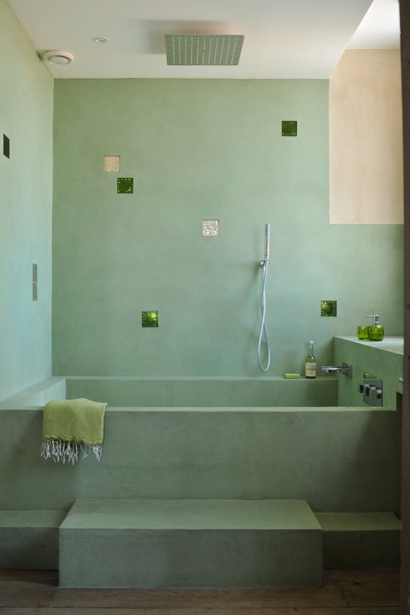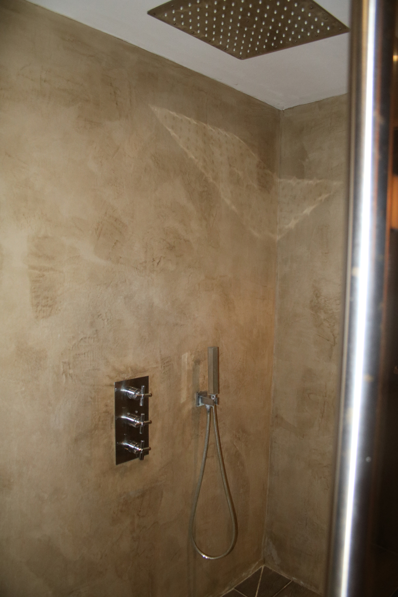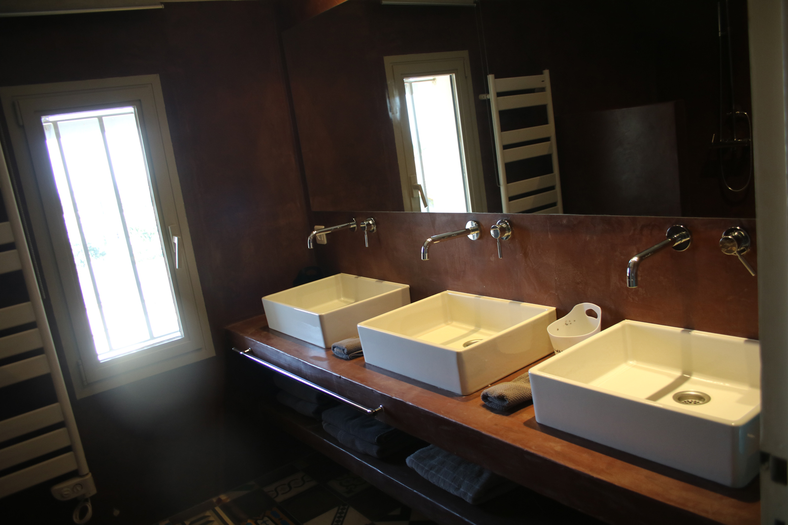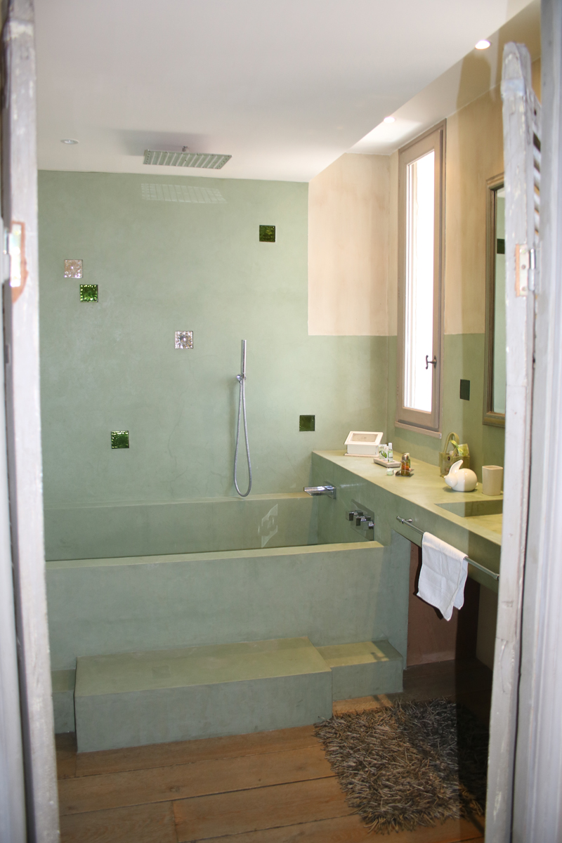 Salle de bain partagée pour les chambres 8 et 9, avec double douche et triple vasque, WC séparé et urinoir, dans l’esprit des vestiaires d’un club de sport