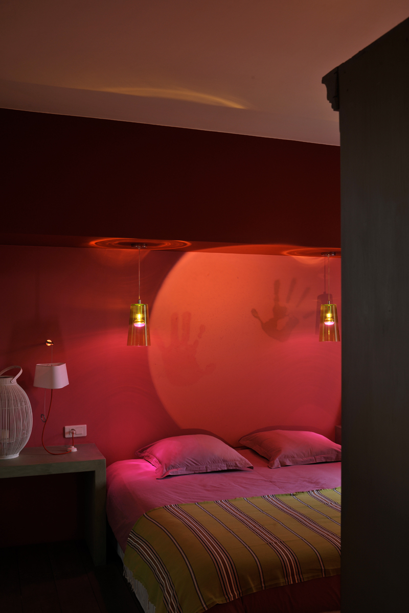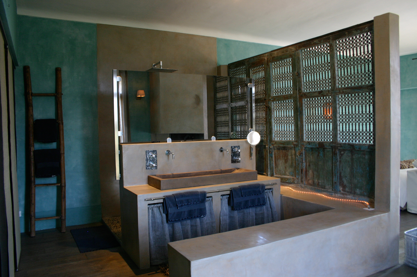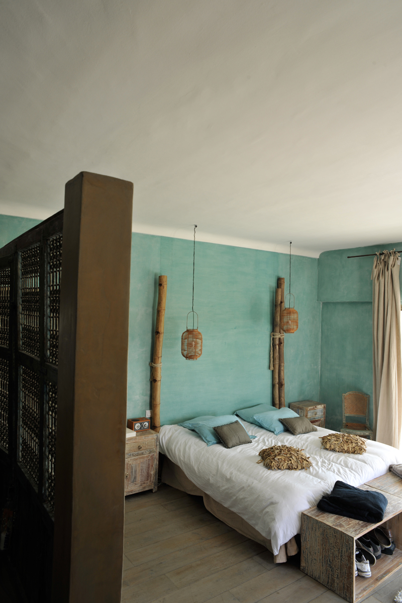 Chambre de Maître n°3 avec lit 200, dressing et Salle de bain en suite avec douche, lavabo double et Terrasse privative faisant tout le tour et escalier en colimaçon menant sur une terrasse supérieure pour contempler le Mont Ventoux