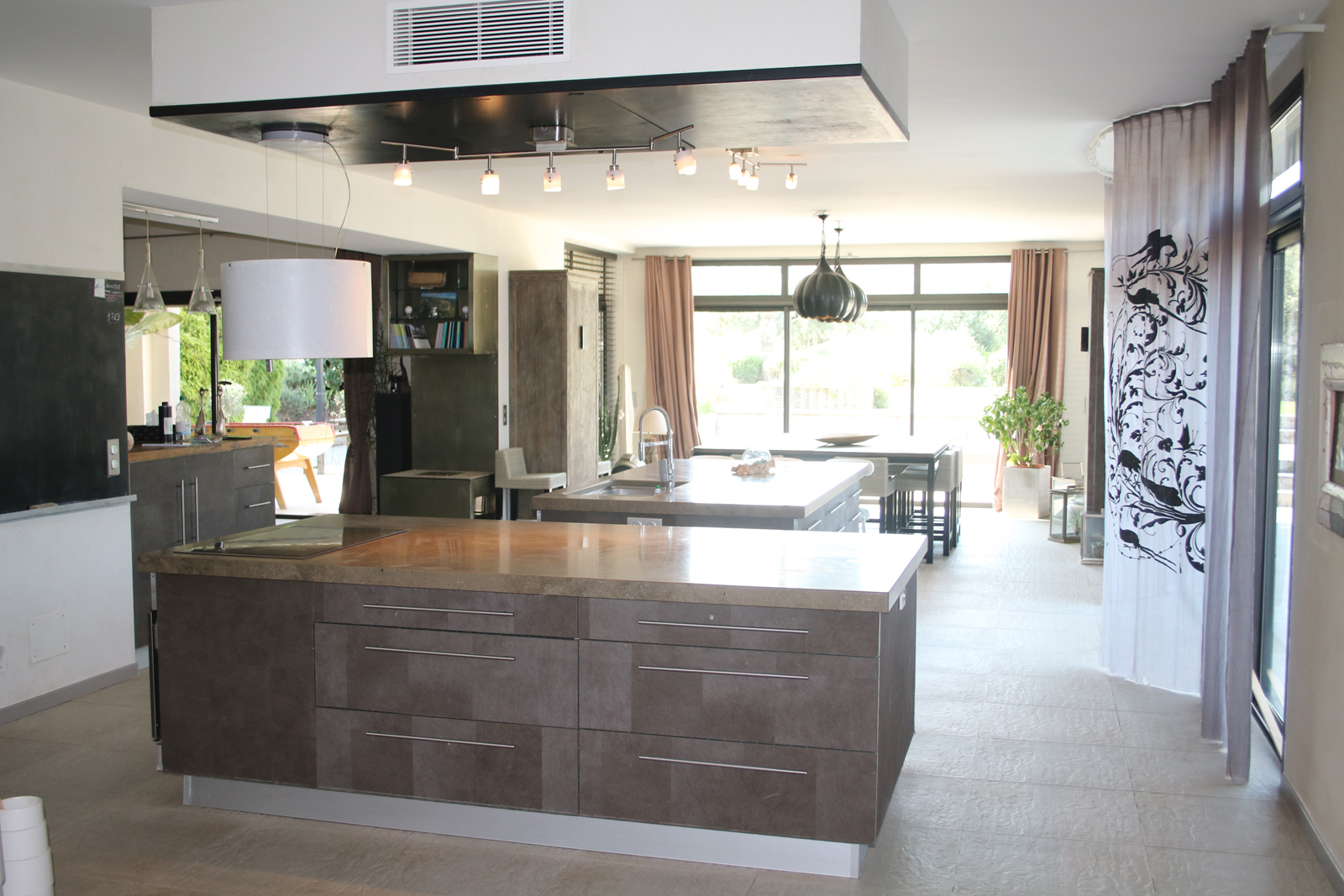 Cuisine ouverte avec machine à glacons, réfrigérateur, four électrique, four micro ondes, plaques à induction, cafetière nespresso, grille pain, bouilloire