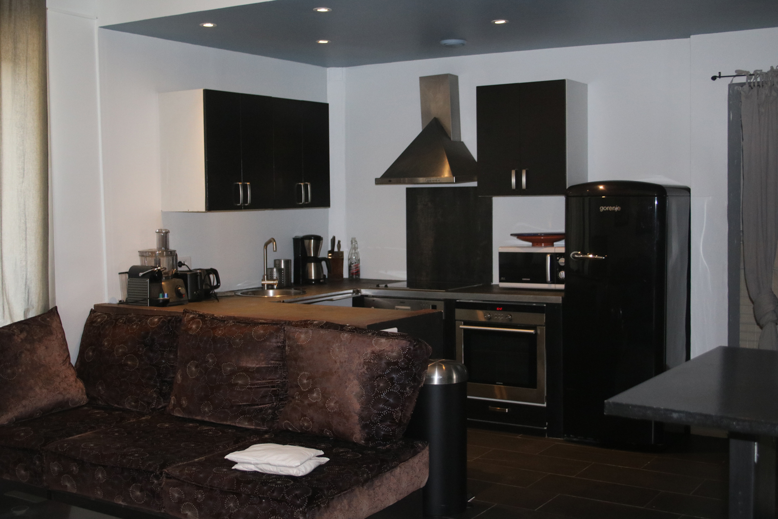 Cuisine ouverte avec cafetière nespresso, four électrique, four micro ondes, lave vaisselle