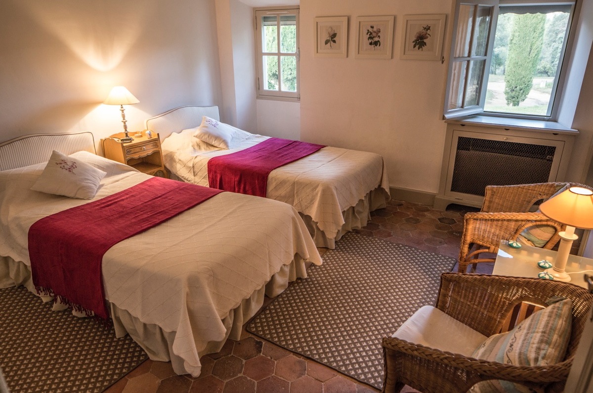 Chambre à lits jumeaux exposée au sud avec mobilier chiné