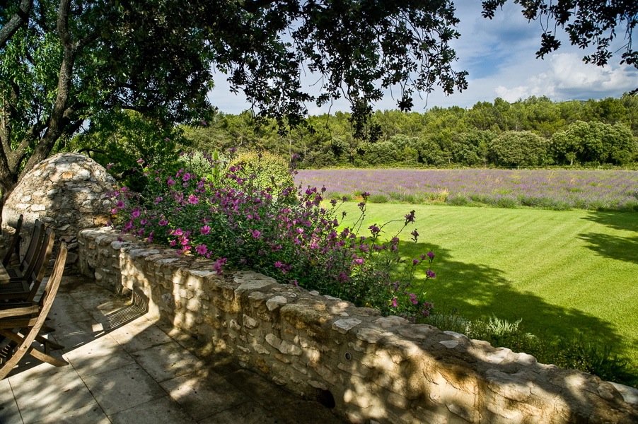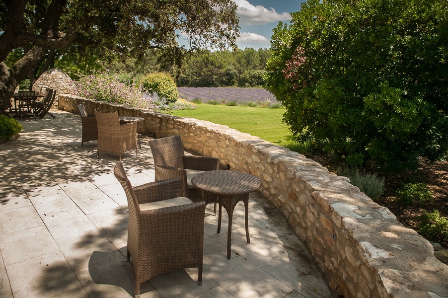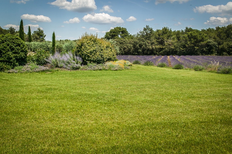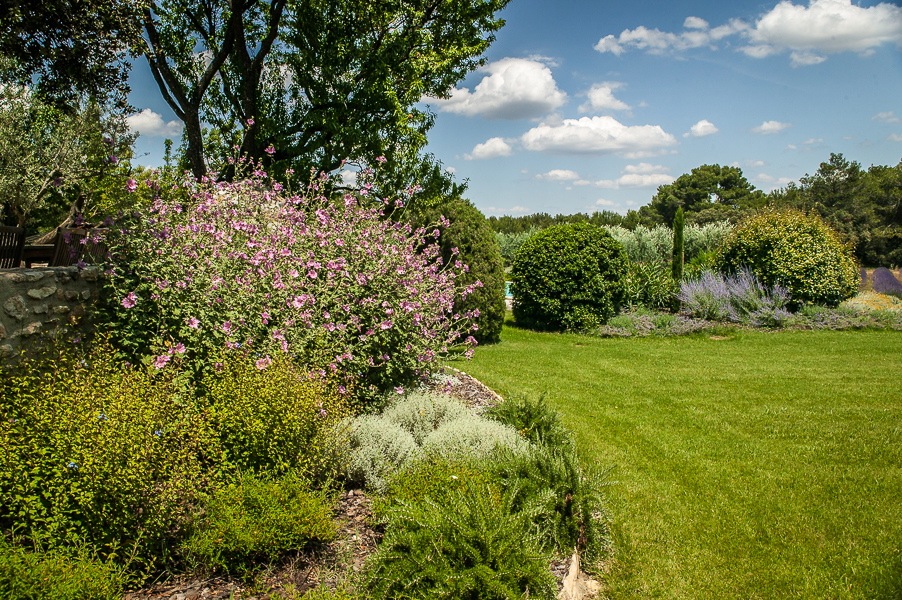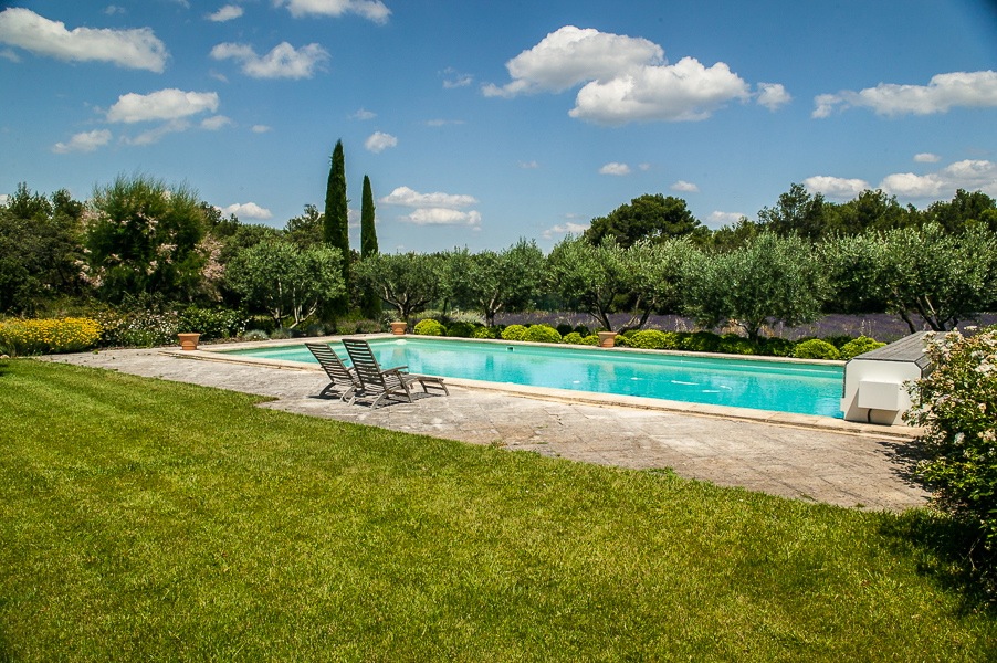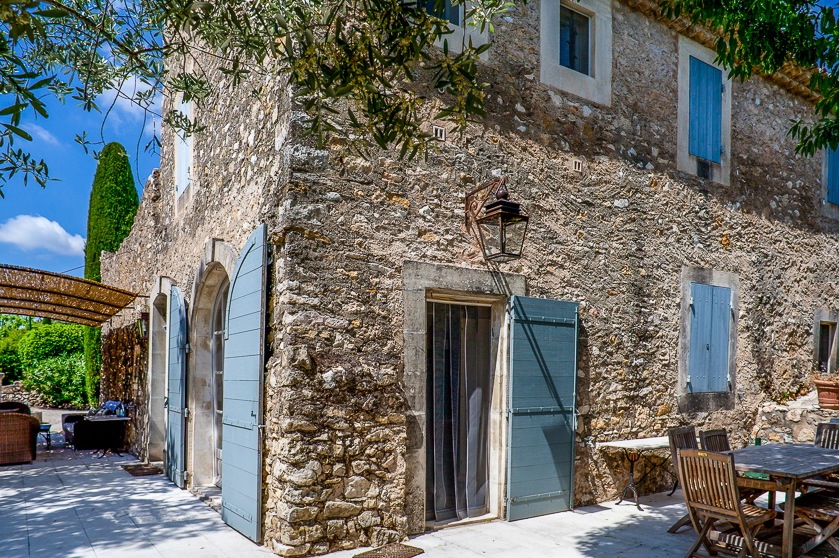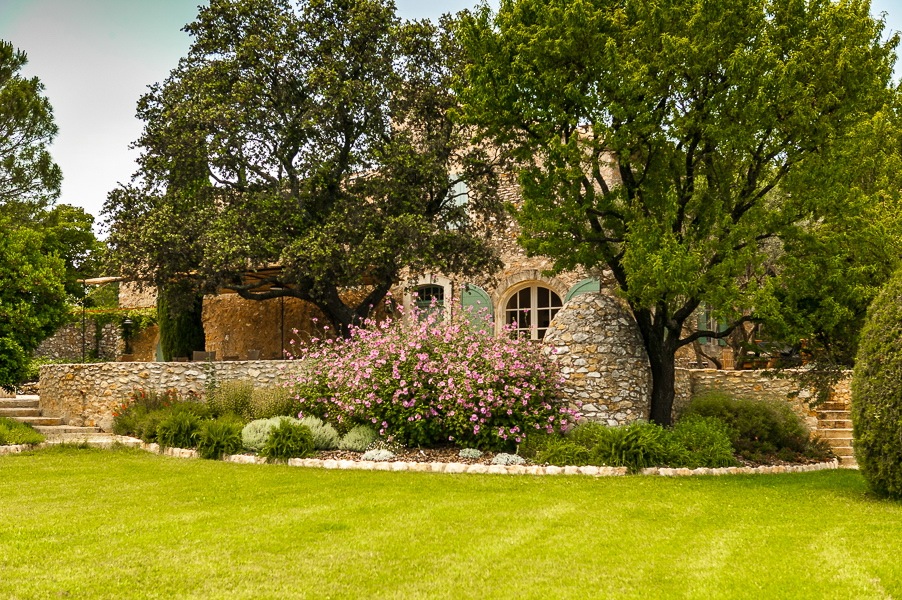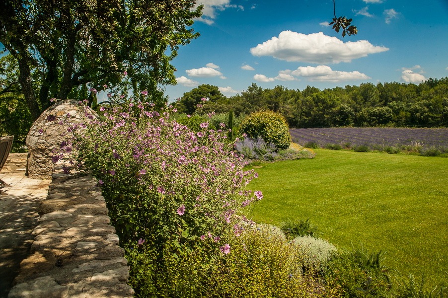 Il a été admirablement restauré et déploie ses façades aux pierres semi-apparentes, baignées de lumière. Le mas étant construit sur un terrain légèrement en pente, une partie est au niveau du jardin une autre en aplomb dudit jardin paysagé fleuri aux essences multiples et à l’abondante végétation, une piscine et son pool house, dont on devine aisément l'immense confort de vie et en fond d'écran, un champ de lavandes jouxtant le champ d'oliviers, aperçu à l'arrivée.