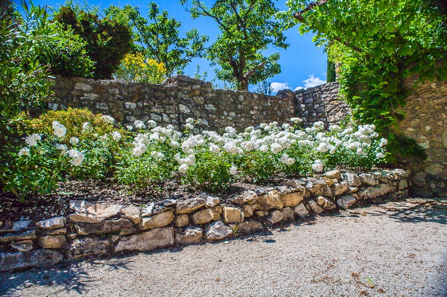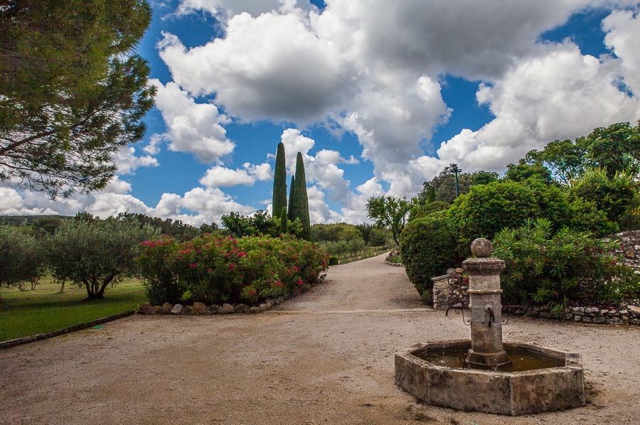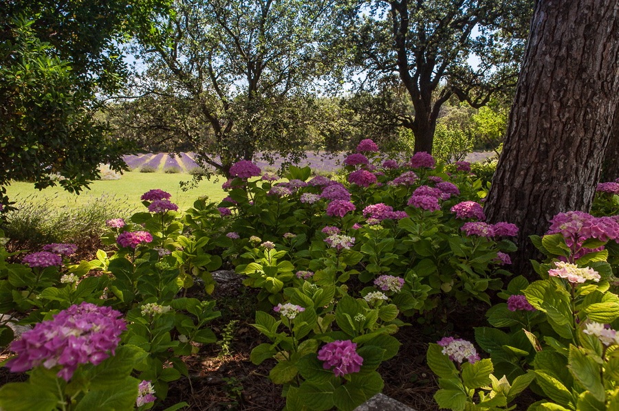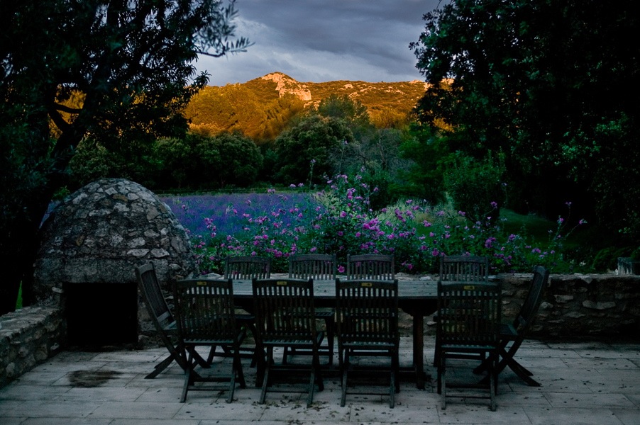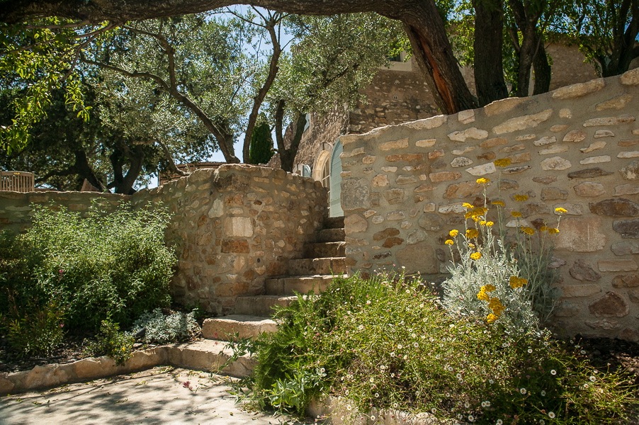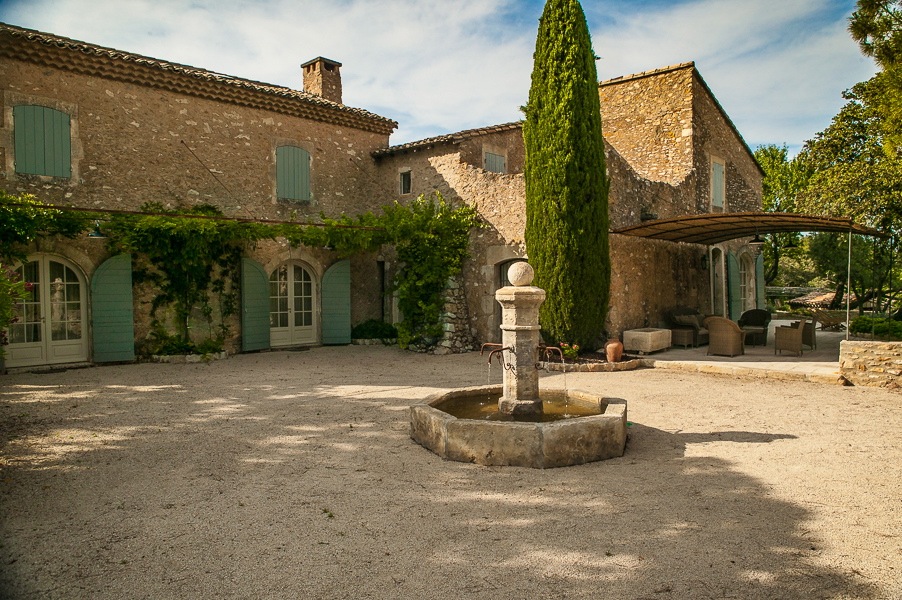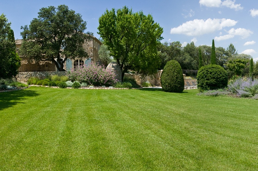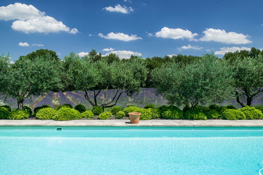 Il a été admirablement restauré et déploie ses façades aux pierres semi-apparentes, baignées de lumière. Le mas étant construit sur un terrain légèrement en pente, une partie est au niveau du jardin une autre en aplomb dudit jardin paysagé fleuri aux essences multiples et à l’abondante végétation, une piscine et son pool house, dont on devine aisément l'immense confort de vie et en fond d'écran, un champ de lavandes jouxtant le champ d'oliviers, aperçu à l'arrivée.