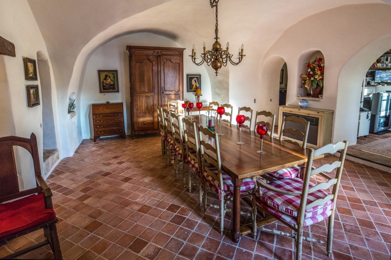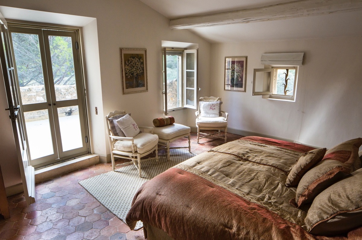 Depuis la petite route qui conduit au délicieux village d'Eygalières dans les Alpilles, un chemin forestier s'aventure dans les collines... Là, quelques propriétés en quête de calme et de discrétion, ont élu domicile... Et c'est tout au bout de ce chemin que se trouve cet élégant mas ancien. L'entrée de la propriété est ponctuée par un imposant portail en fer forgé au-delà duquel sur la gauche se trouve la maison du gardien. Par une allée en pente douce longeant bosquets, bordures et un champ d'oliviers on rejoint une vaste esplanade où, à proximité des communs, d'une aire de stationnement et d'une fontaine, légèrement en retrait, s'inscrit un beau Mas en pierres, dans son espace naturel.