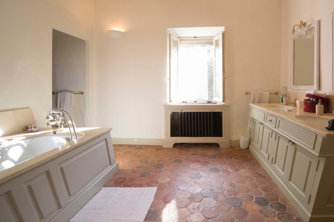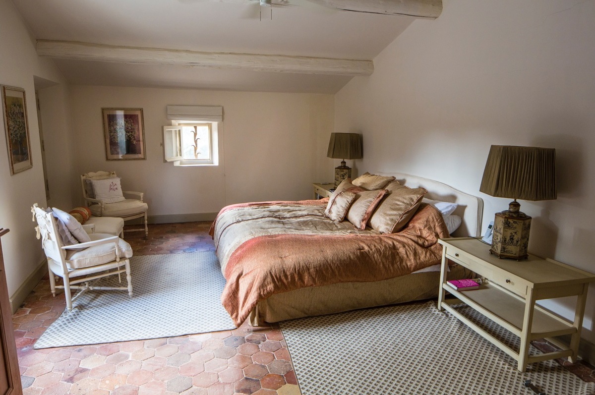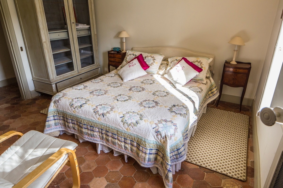 Chambre double orientée au sud avec lit 140 et Salle de bain en suite avec baignoire, wc
