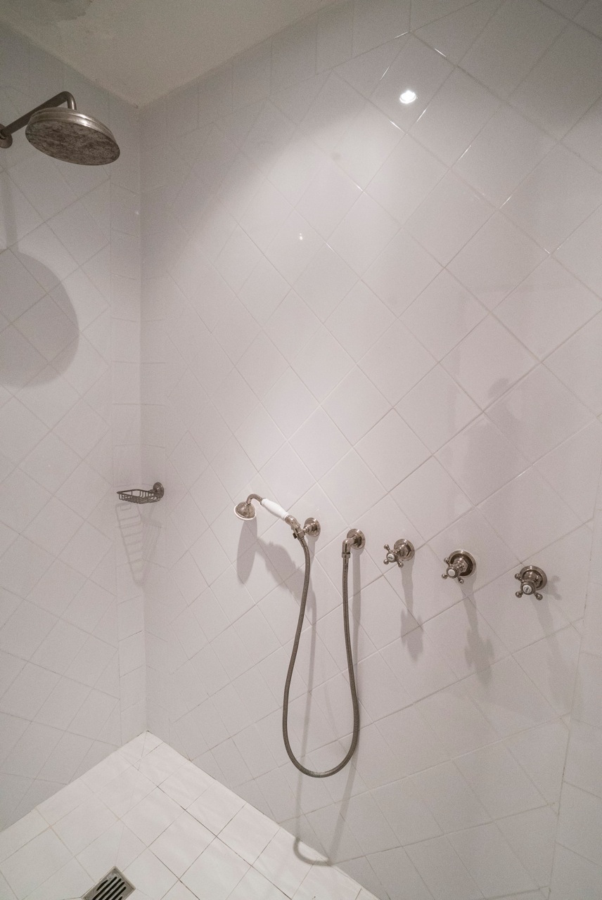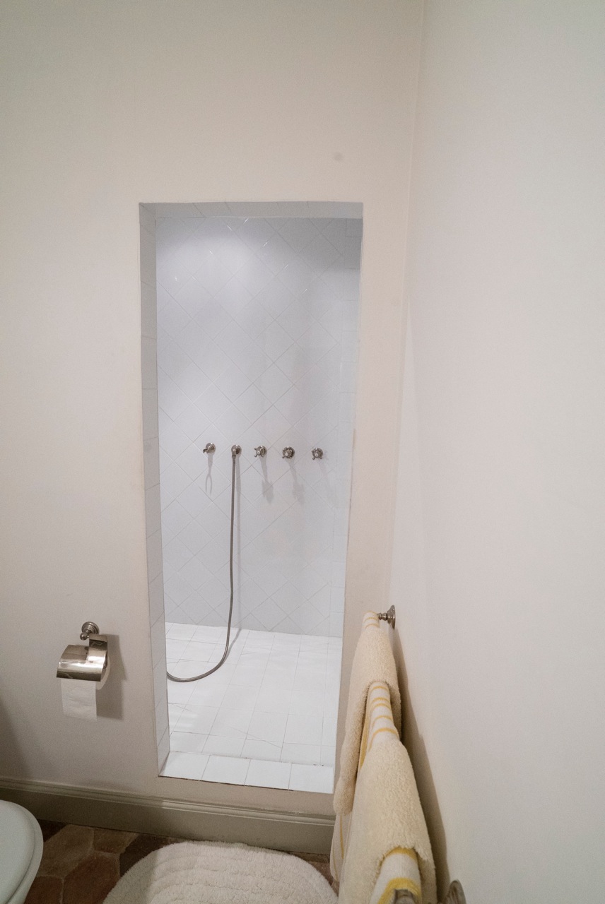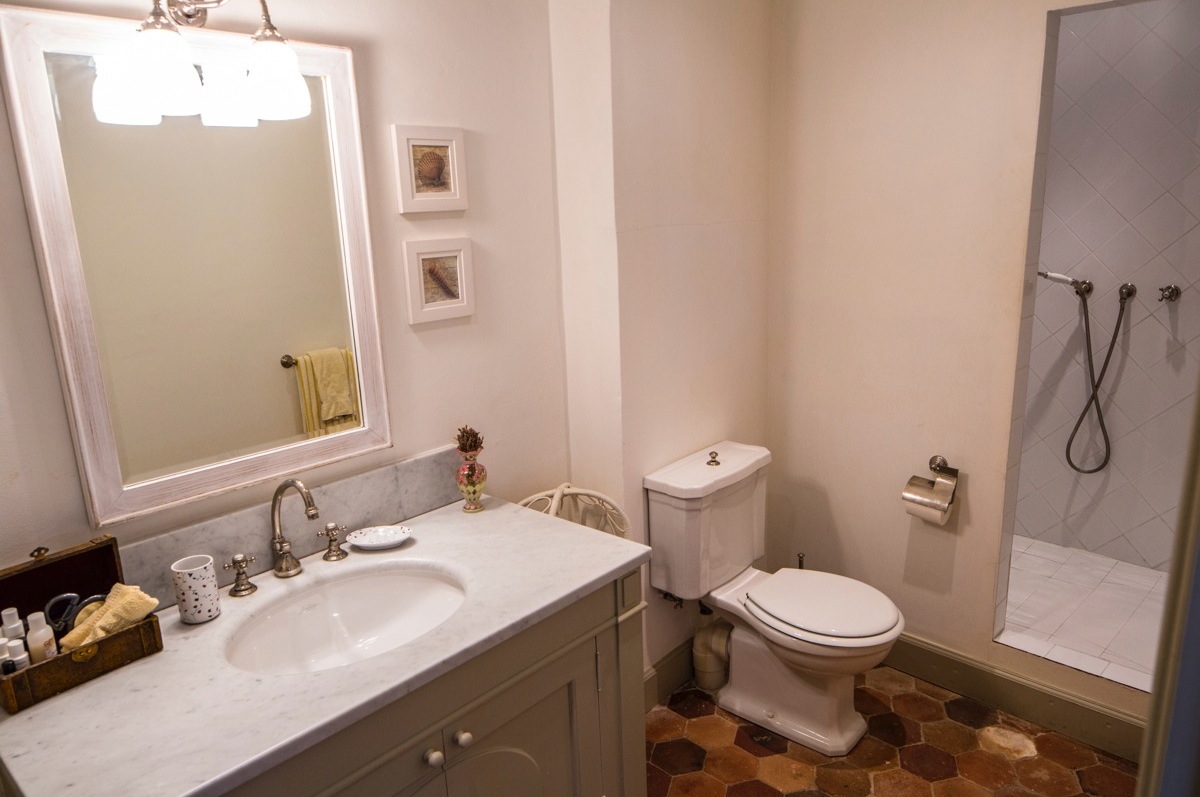 Chambre à lits jumeaux avec des fenêtres ouvrent sur l’arrière de la maison et Salle de bain en suite avec douche, wc