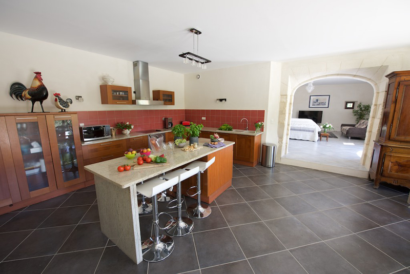 Cuisine à l’italienne, en marbre, avec un îlot central pour les repas avec plaques à induction, réfrigérateur, cafetière, grille pain, lave vaisselle, four électrique, four micro ondes, congélateur