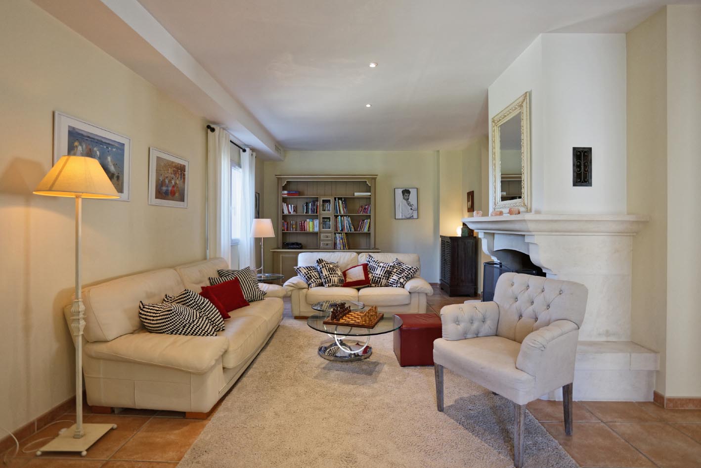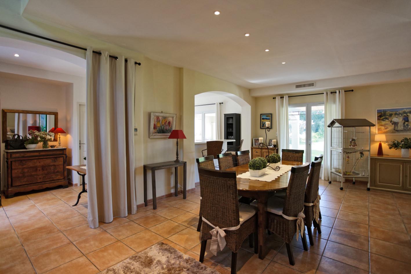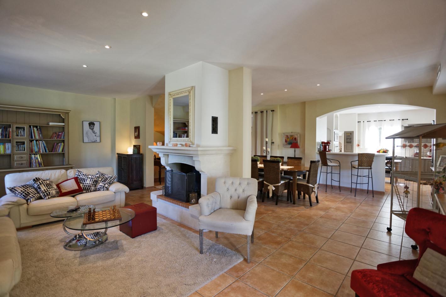 Salon - salle à manger avec cheminée, accès terrasse