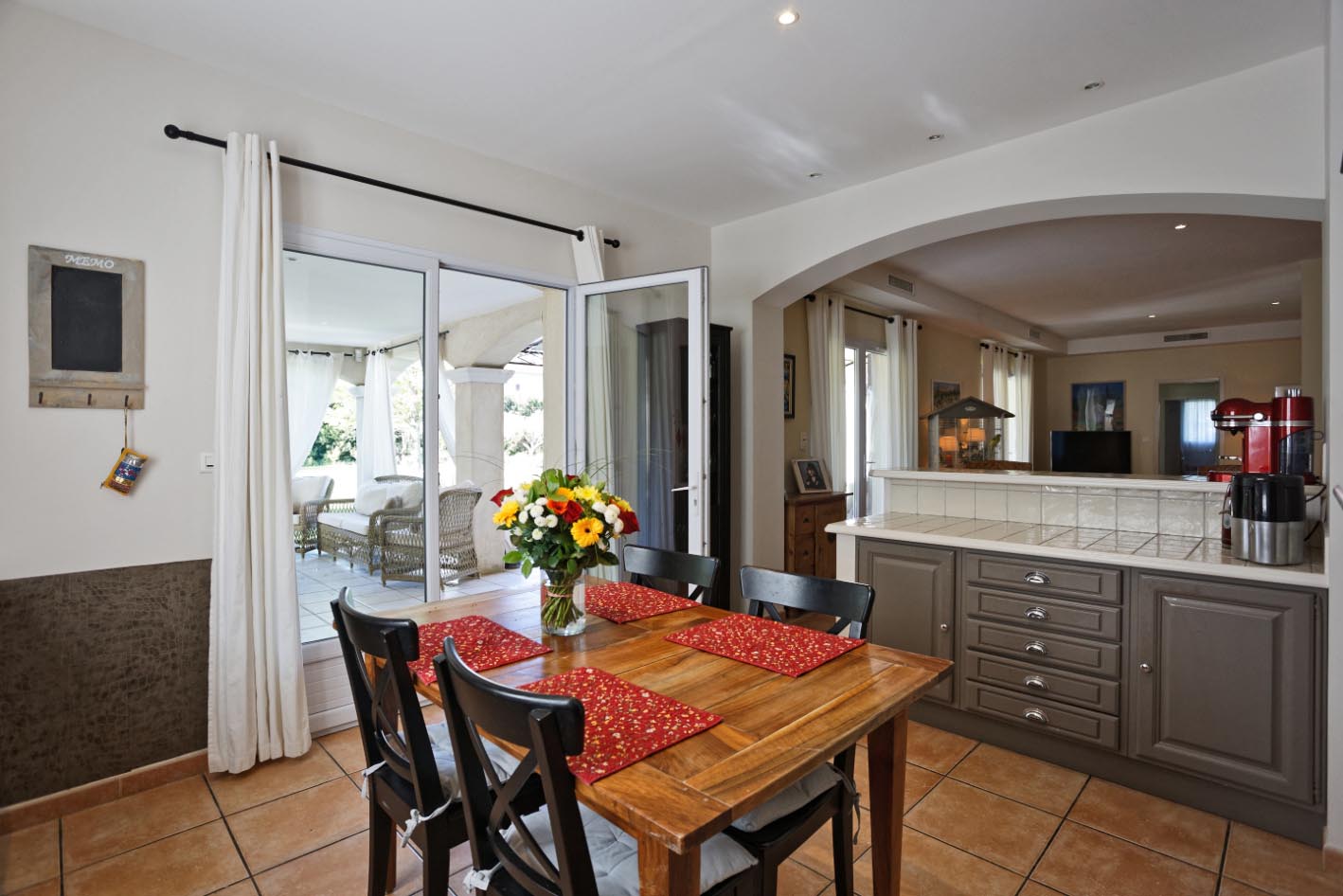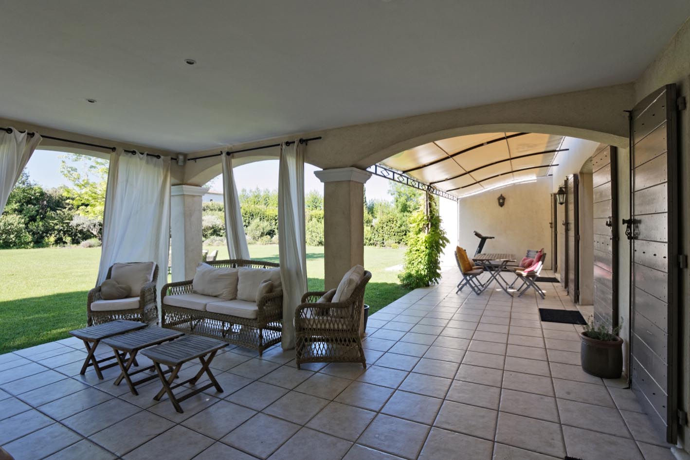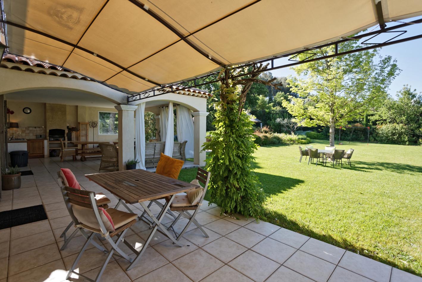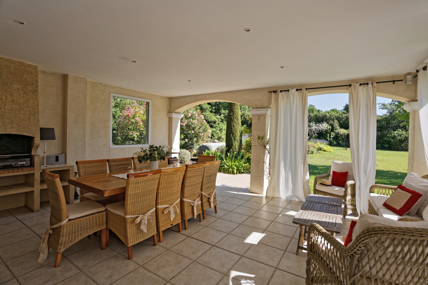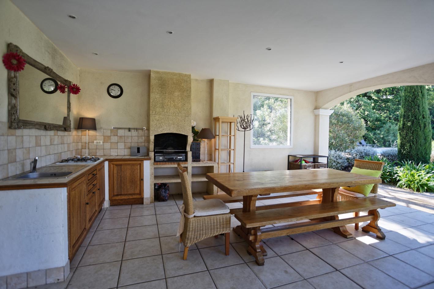 Terrasse couverte et aménagée avec cuisine d’été, coin salon