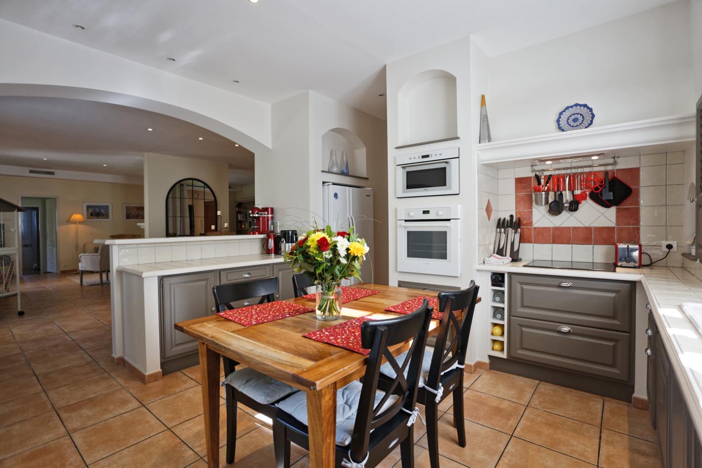 Cuisine dinatoire avec réfrigérateur, plaques vitrocéramiques, bouilloire, four à gaz, grille pain, cafetière nespresso, congélateur