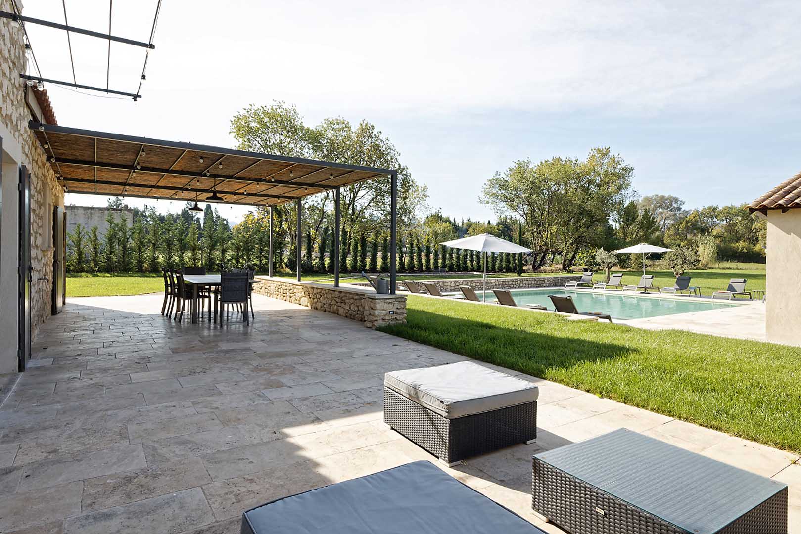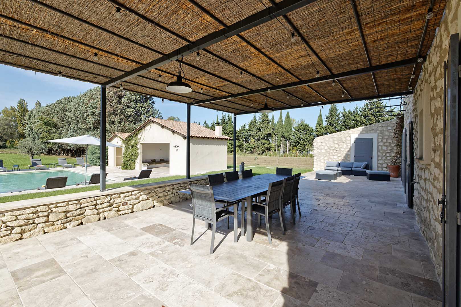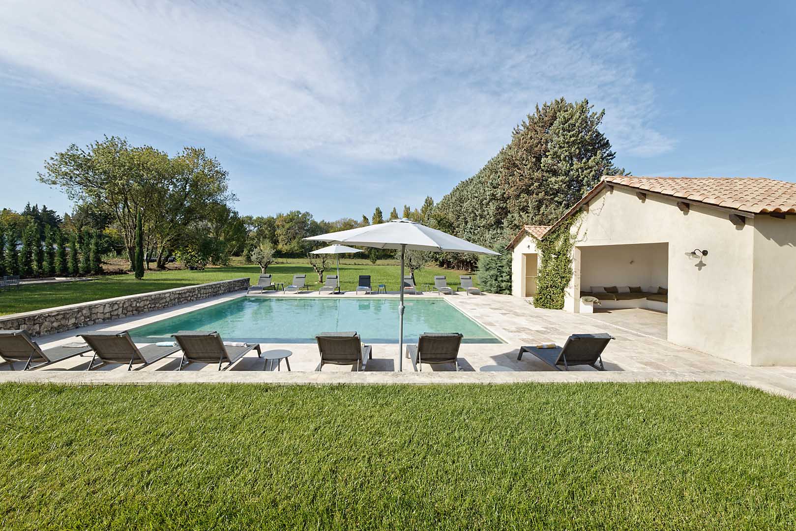 Cette grande maison est parfaite pour séjourner en toute quiétude. L’extérieur du mas est très bien aménagé : la pergola de 75m2 apporte de l’ombre au dessus de l’espace des repas dont la vue donne sur la piscine. Plus loin, vous profiterez d’un pool house de 45 m2 avec un îlot central qui rendra conviviaux les moments après la baignade.