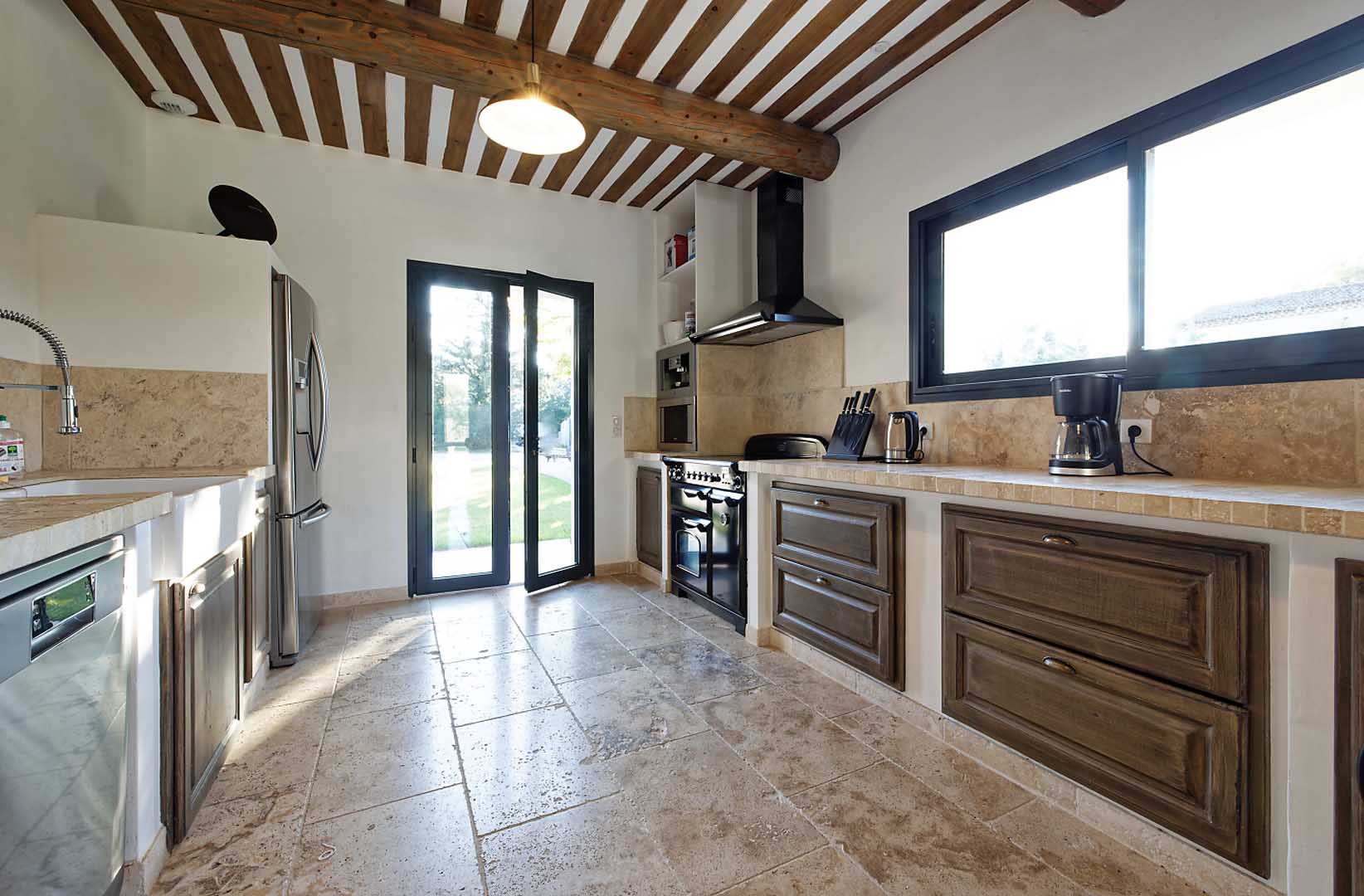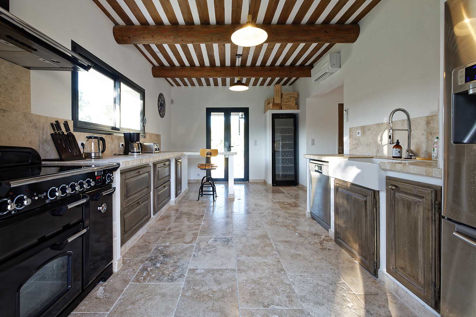 Cuisine avec four micro ondes, grille pain, congélateur, réfrigérateur, lave vaisselle, cave à vins, lave linge, sèche linge
