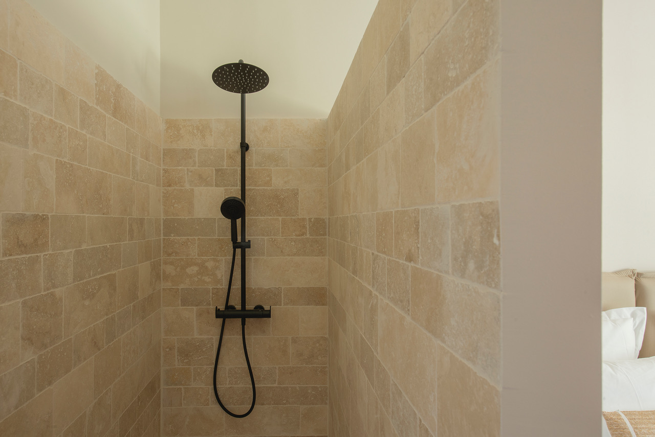 Chambre double de 12 m2 avec vue piscine et Salle de bain en suite avec douche, lavabo simple