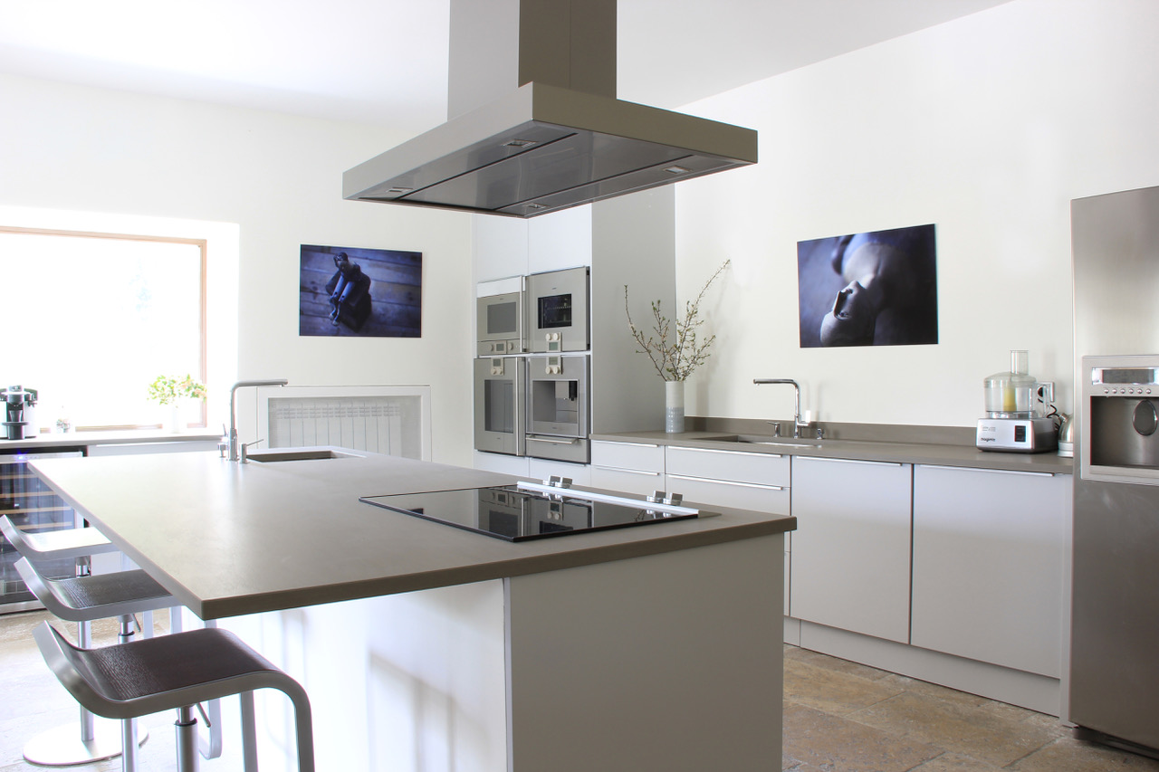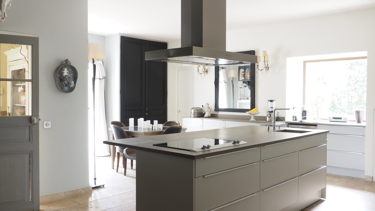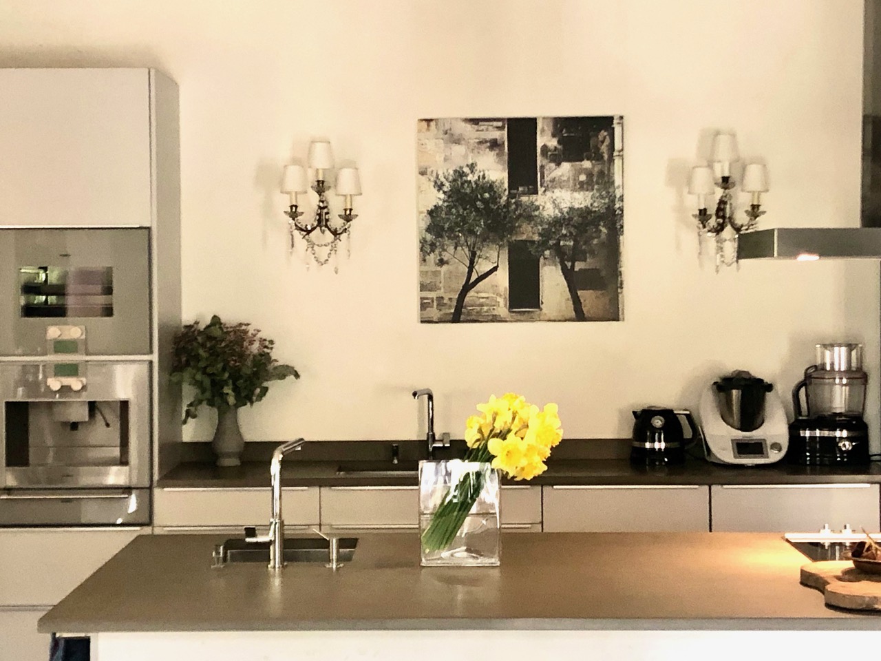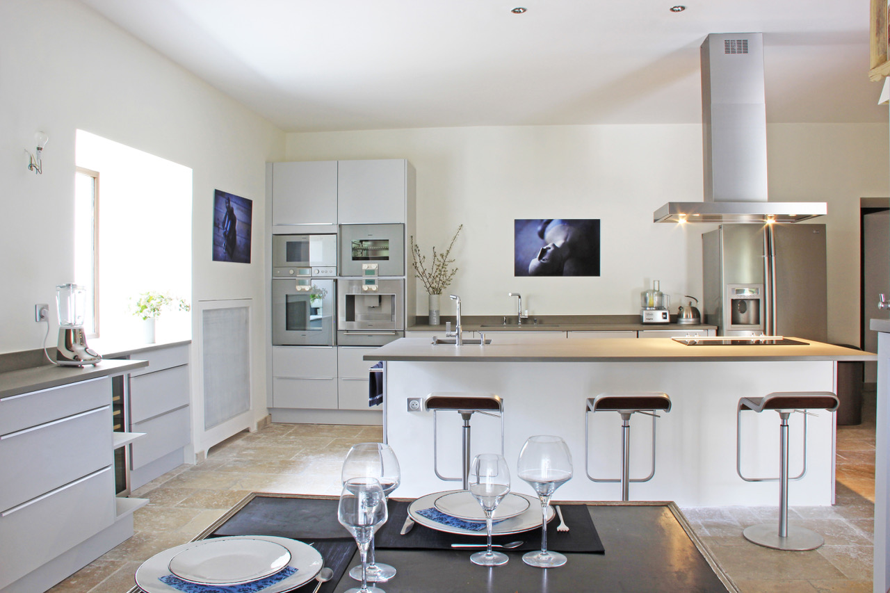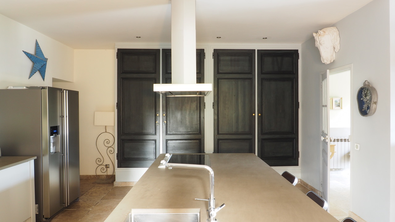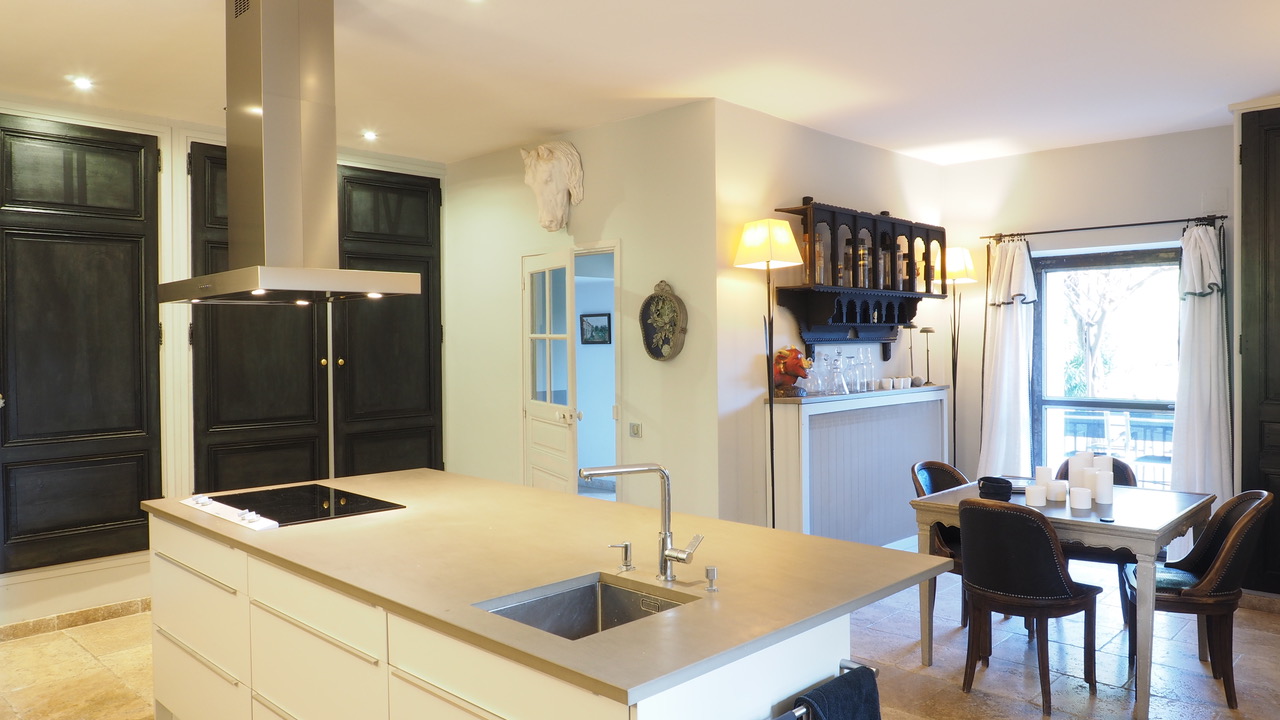 Cuisine avec réfrigérateur, lave vaisselle, four électrique, cafetière, plaques à induction, four à vapeur, four micro ondes, grille pain, cafetière nespresso, bouilloire, machine à expresso, cave à vins