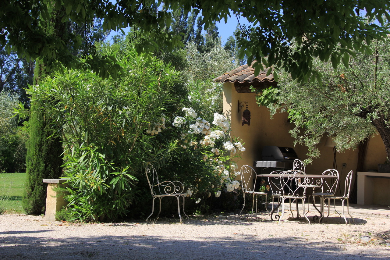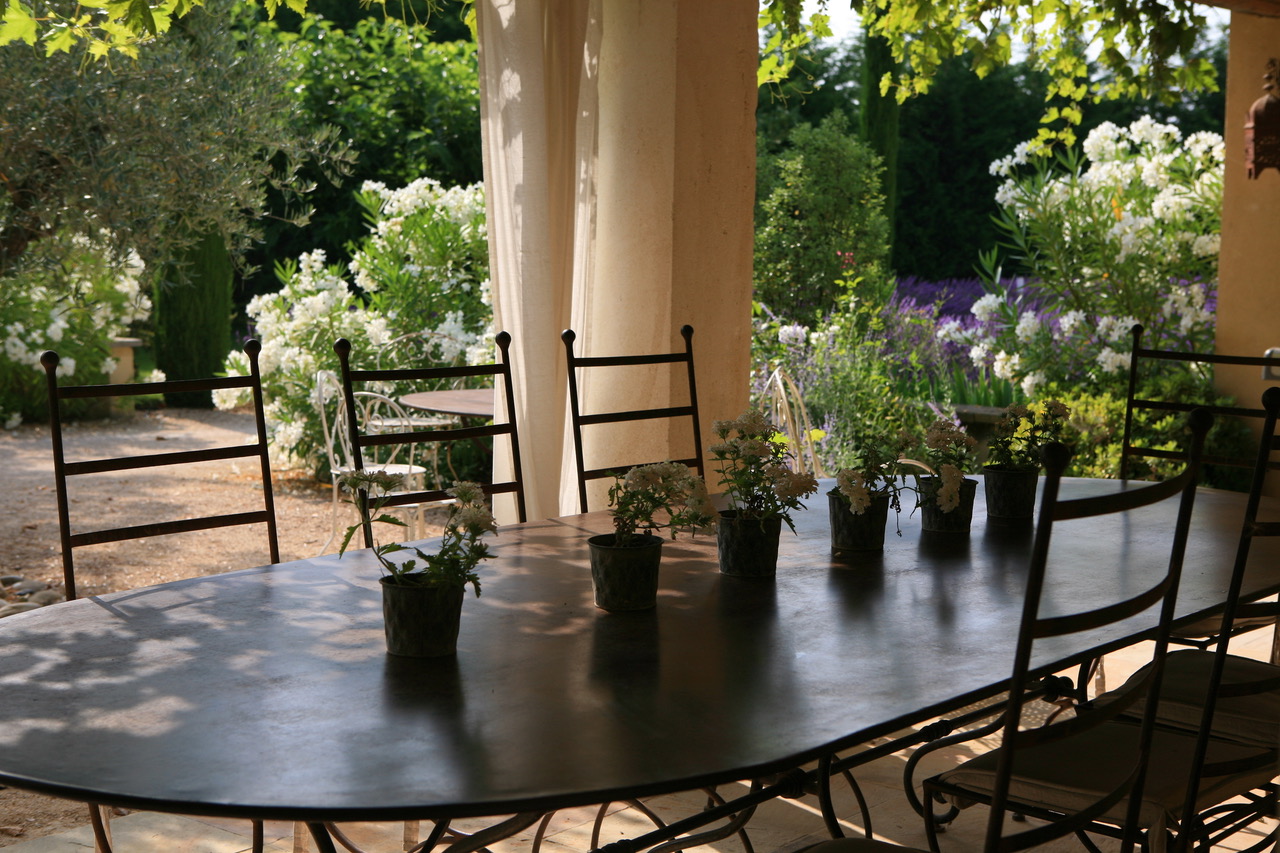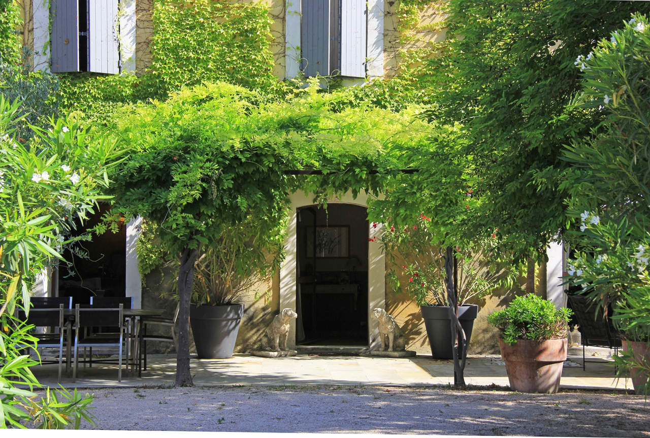 Une imposante glycine orne la terrasse à l’avant de la propriété. En se rapprochant, on remarque de part et d’autre : un salon d’été, une cuisine d’été et sa salle à manger couverte, une seconde table pour déjeuner sous la glycine.
