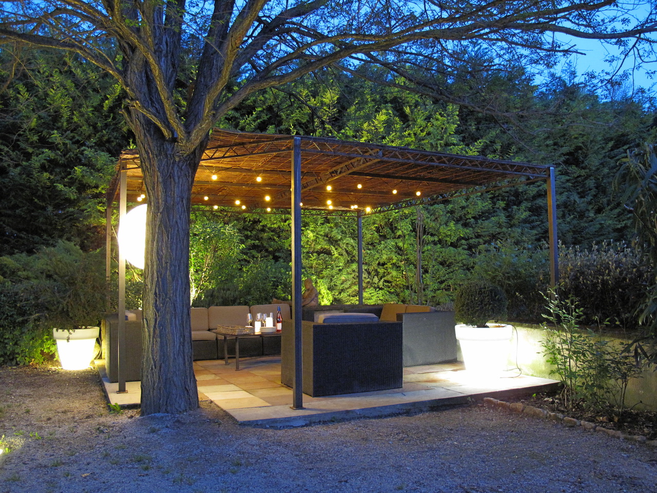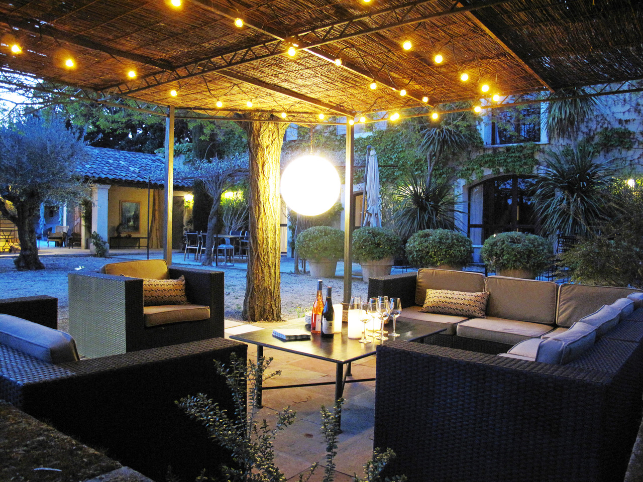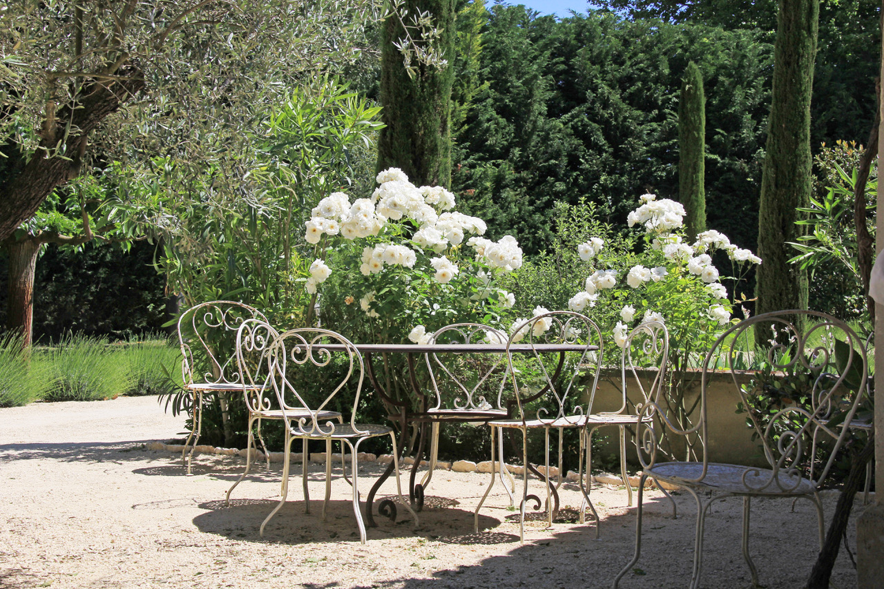 Une imposante glycine orne la terrasse à l’avant de la propriété. En se rapprochant, on remarque de part et d’autre : un salon d’été, une cuisine d’été et sa salle à manger couverte, une seconde table pour déjeuner sous la glycine.