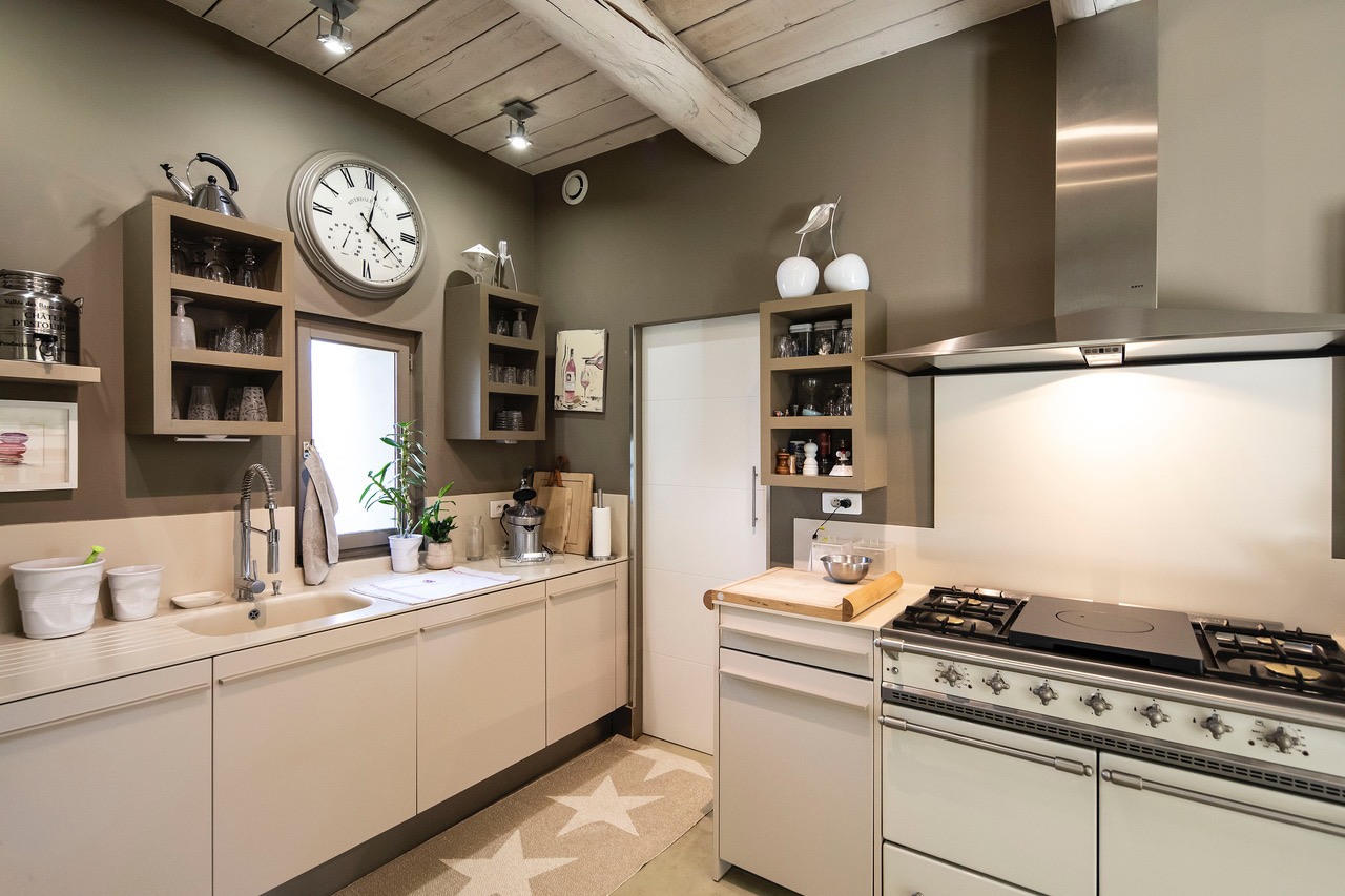 Cuisine ouverte avec four à gaz, réfrigérateur, congélateur