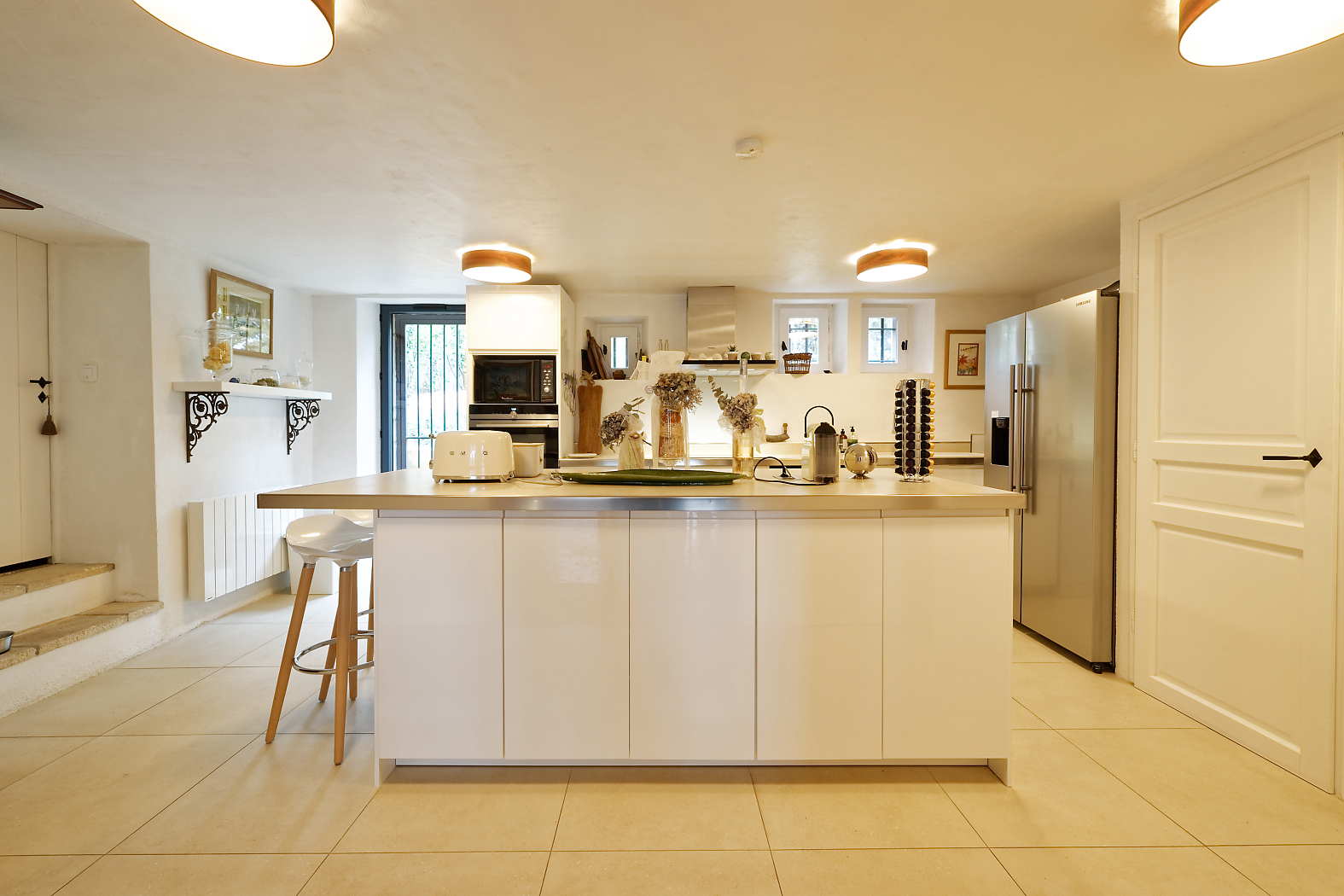 Cuisine ouverte avec réfrigérateur, congélateur, four à vapeur, four électrique, cave à vins, lave vaisselle
