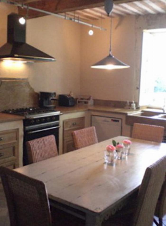 Cuisine avec cheminée, table de cuisson à gaz, four à gaz, lave vaisselle, cafetière, machine à expresso, grille pain