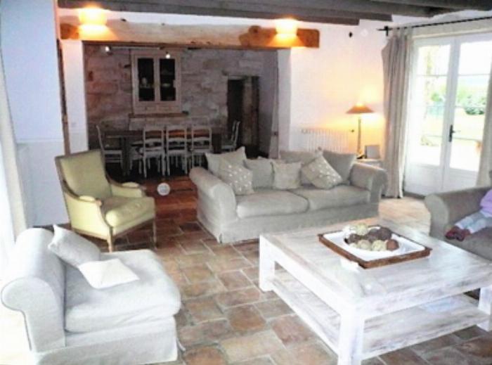 Salon - salle à manger avec accès terrasse, lecteur dvd, télévision, chaine hifi, home cinema, cheminée