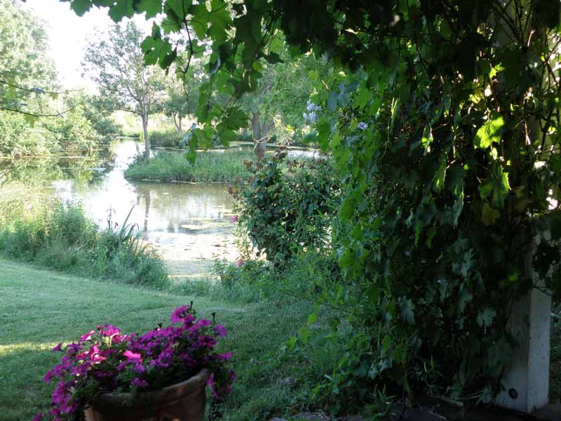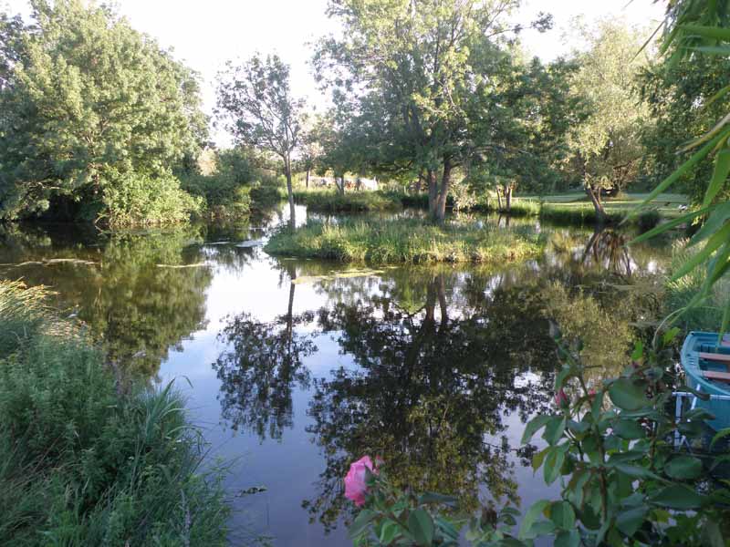 Chambre double donnant sur les marais et Salle de bain en suite avec lavabo simple, douche, wc