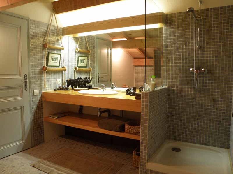 Chambre double et Salle de bain en suite avec douche, lavabo simple et WC séparés, dans le couloir