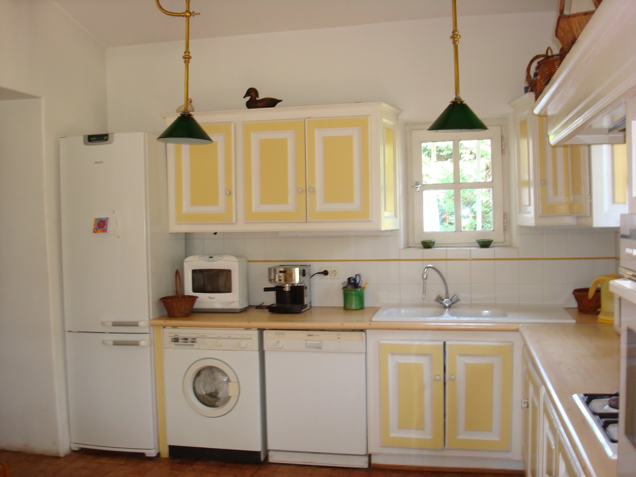 Cuisine avec lave linge, réfrigérateur, lave vaisselle, four micro ondes, four électrique