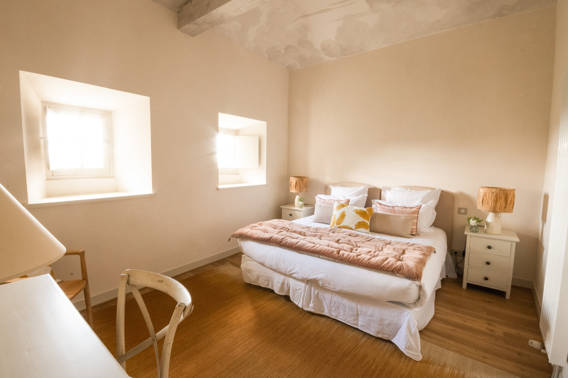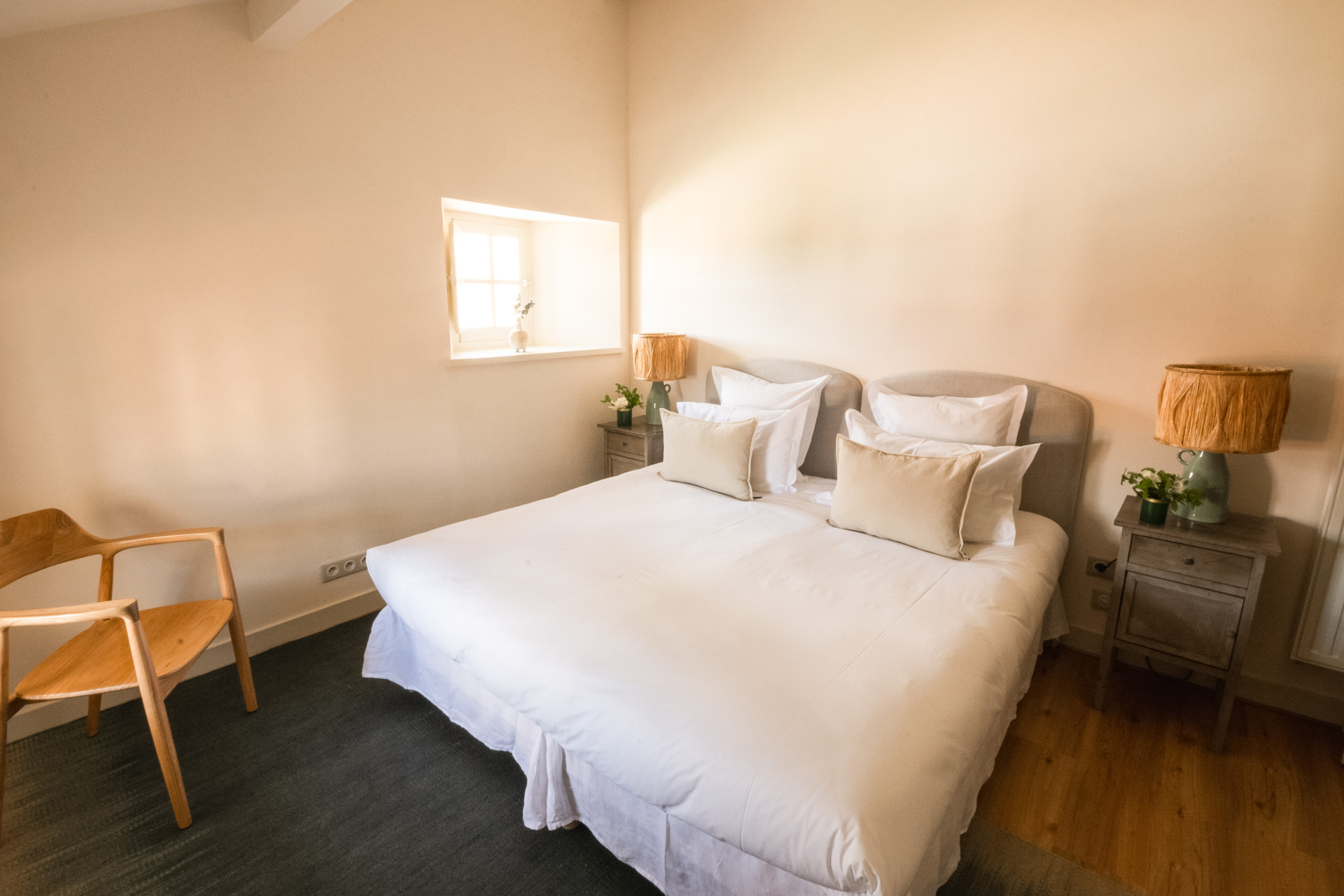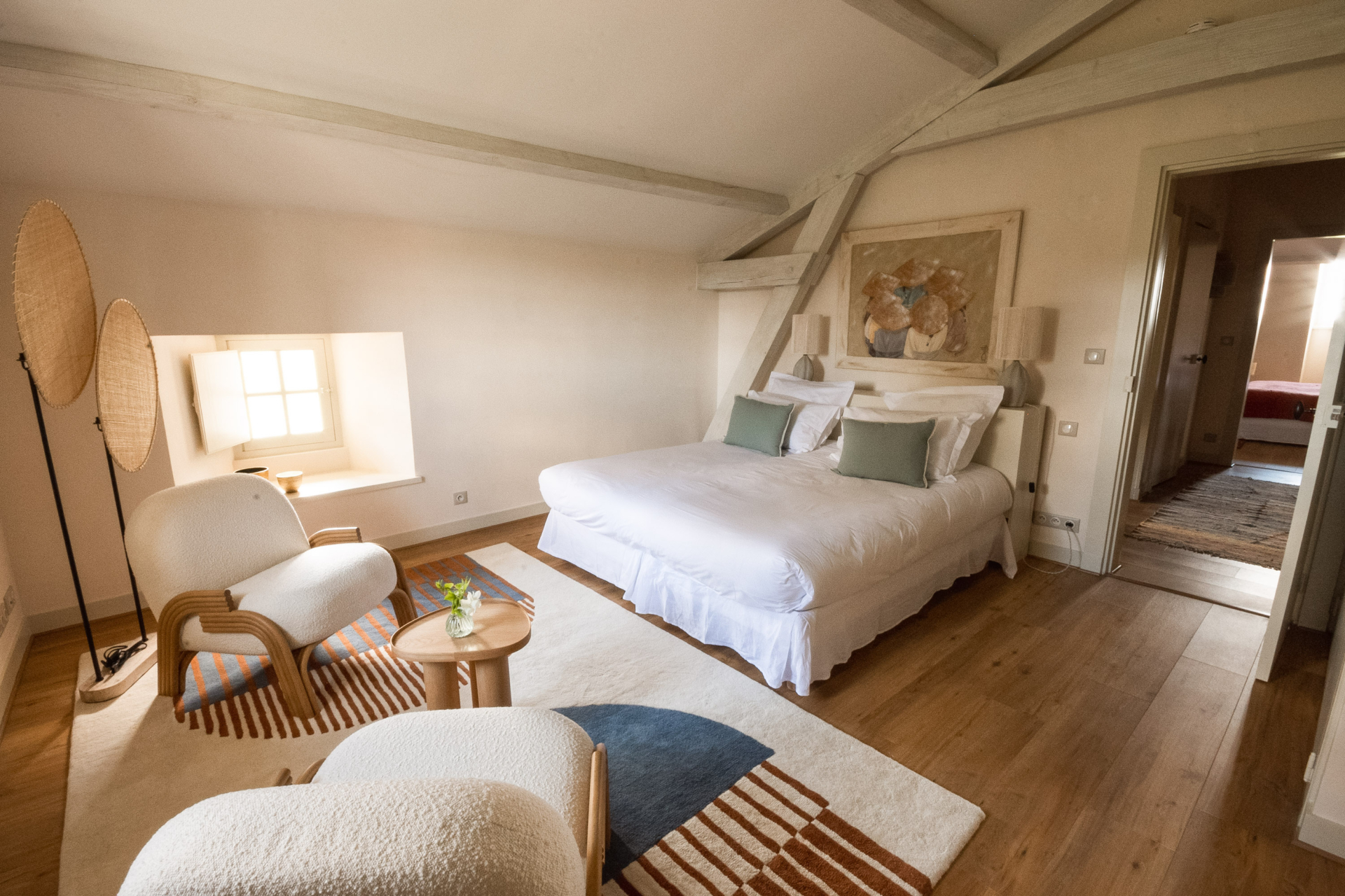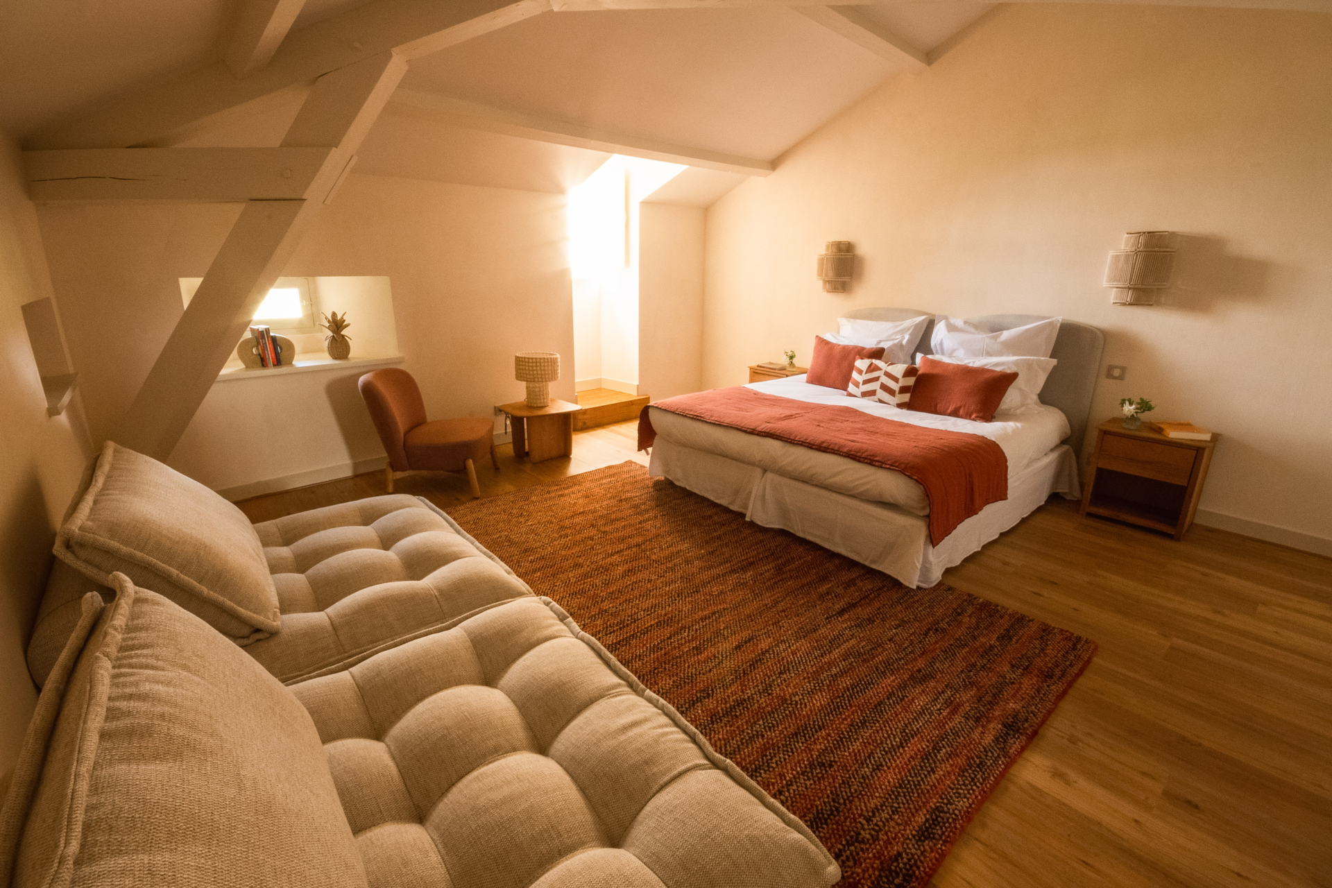 La décoration élégante et raffinée, les matériaux et les couleurs choisis créent une atmosphère paisible avec une vue reposante sur le paysage bucolique.