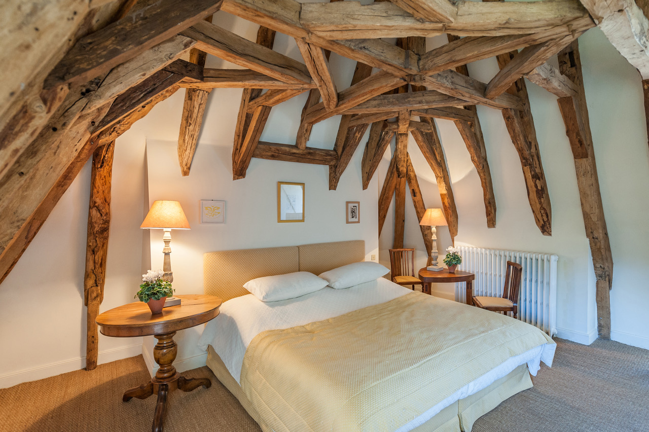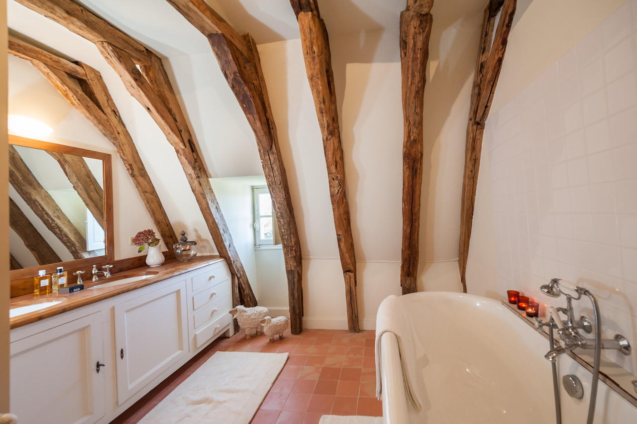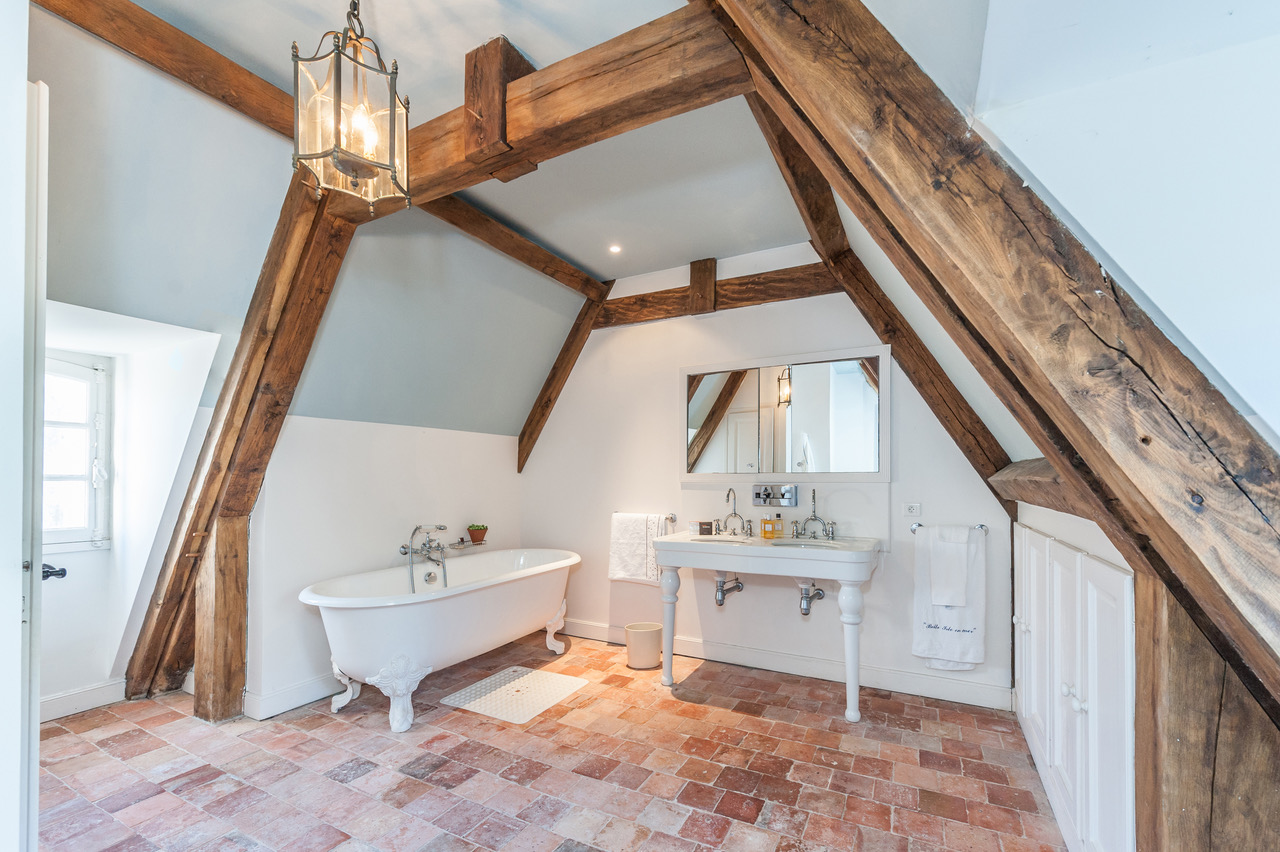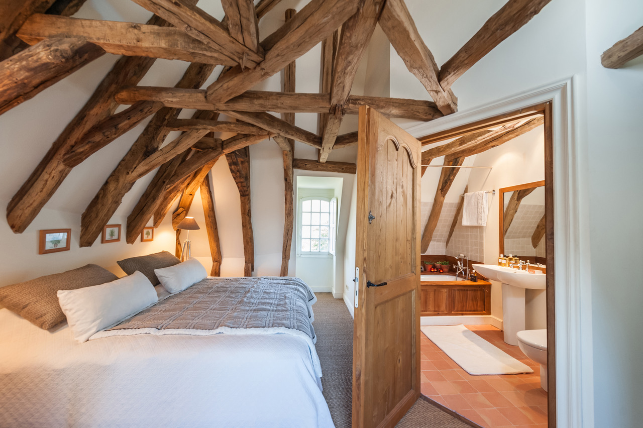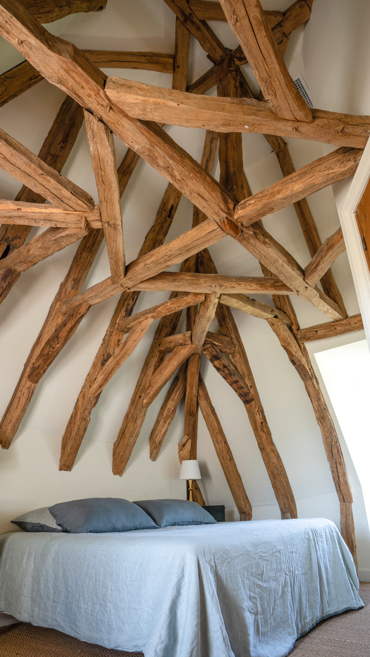 Un imposant escalier conçu en pierres, permettant d’accéder aux deux espaces nuit, confère à cette demeure des allures de château. La décoration moderne se marie parfaitement bien avec le mobilier vintage : parfait mélange pour un séjour dans ce cocon familial. Au 2e étage, les poutres de la toiture sont apparentes et donnent à chaque chambre une originalité singulière.