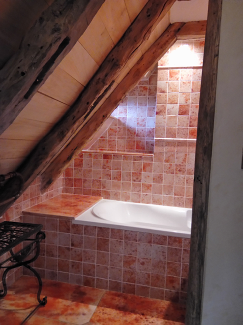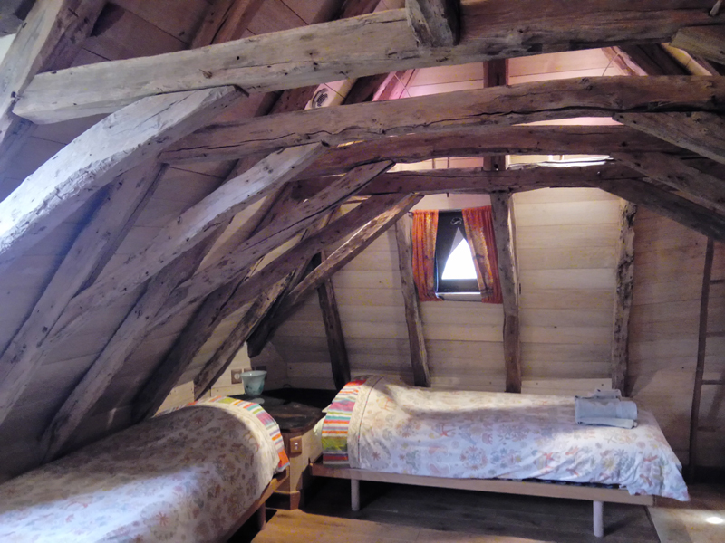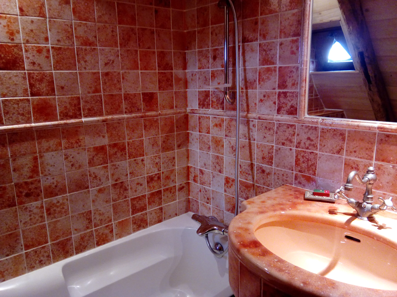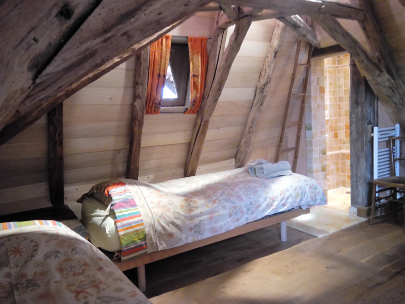 Chambre à lits jumeaux avec lit 90 et Salle de bain en suite petite, en lave émaillée, et située dans la tour du pigeonnier avec douche, lavabo simple