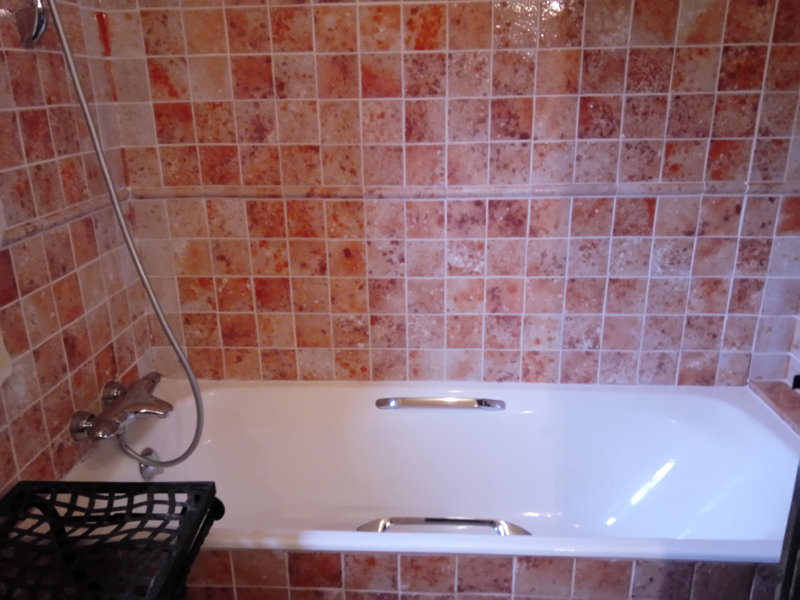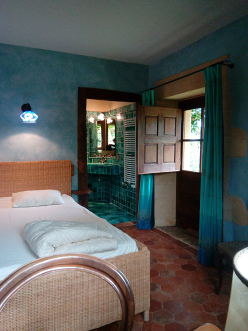 Chambre double avec vue jardin, coin bureau, lit 160 et Salle de bain en suite en lave émaillée avec douche, wc, lavabo simple, chauffe serviettes