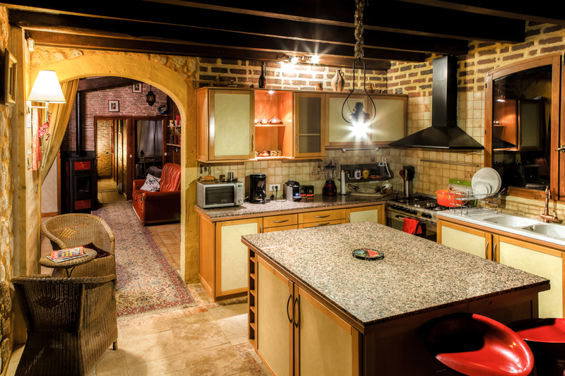 Cuisine avec accès jardin, réfrigérateur, plaques à induction