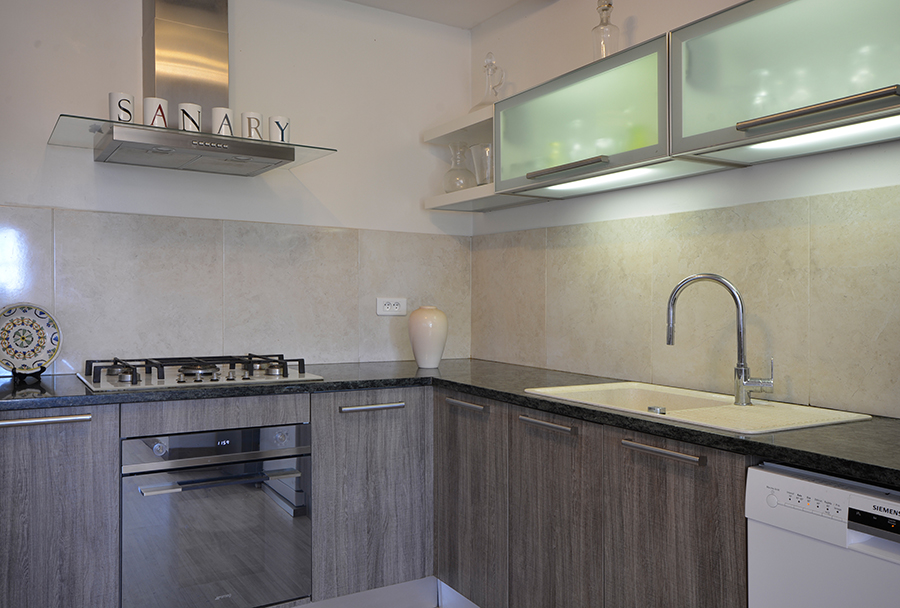 Cuisine avec four électrique, réfrigérateur, cafetière, four micro ondes, grille pain, lave vaisselle, table de cuisson à gaz, bouilloire